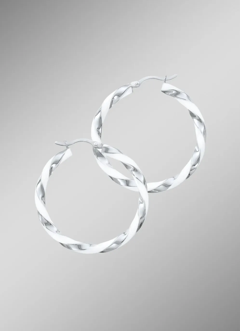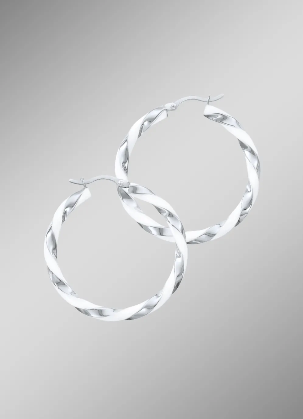 Glanzleistung! Gegen diese Creolen aus Silber 925/- fein ist kaum anzukommen. Dank dem verdrehten Design, teils mit weißem Lack überzogen, betört dieser Ohrschmuck mit reizvollem Glanz. Der Durchmesser beträgt 39 mm.
