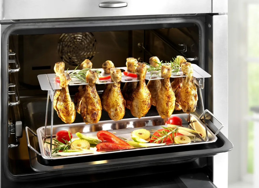 Zum gleichmäßigen und knusprigen Grillen von bis zu 12 Hähnchenkeulen oder Hähnchenflügeln. Außen knusprig, innen saftig, ganz ohne Wenden. Mit Abtropf- und Servierschale. Einklappbares Gestell für platzsparende Auf bewahrung. Spülmaschinenfest. B43,5xH15,8xT15,5 cm.
