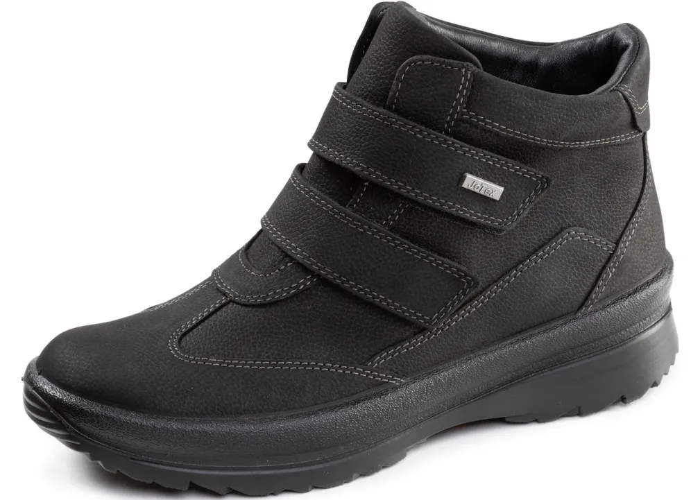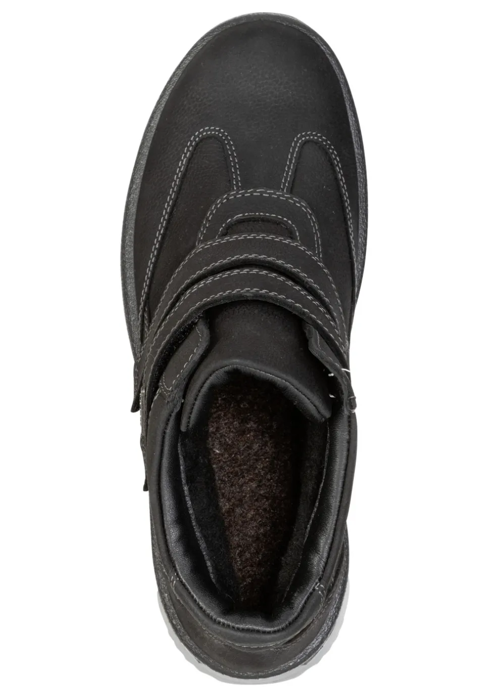 Schwarze Boots aus bestem, genarbtem Nubukleder, mit zwei verstellbaren Klettspangen: Weite H, mit Klimamembrane ausgestattet, warmes Plüschfutter, herausnehmbare Filz-Decksohle, leichte PUR-Profilsohle sowie 20 mm Keilabsatz. Schafthöhe ca. 9 cm
