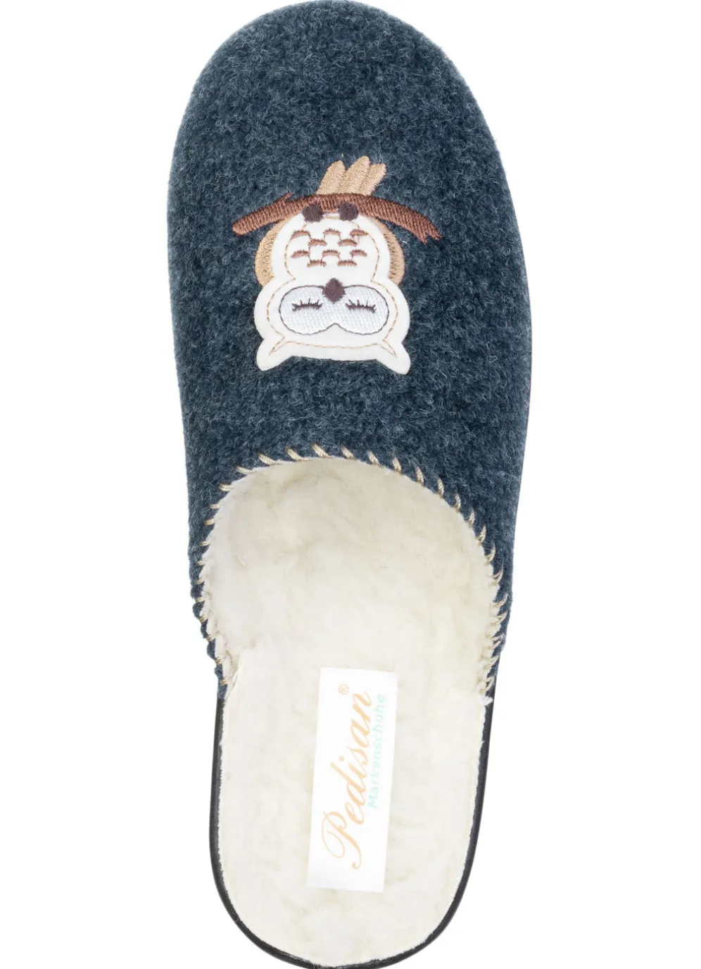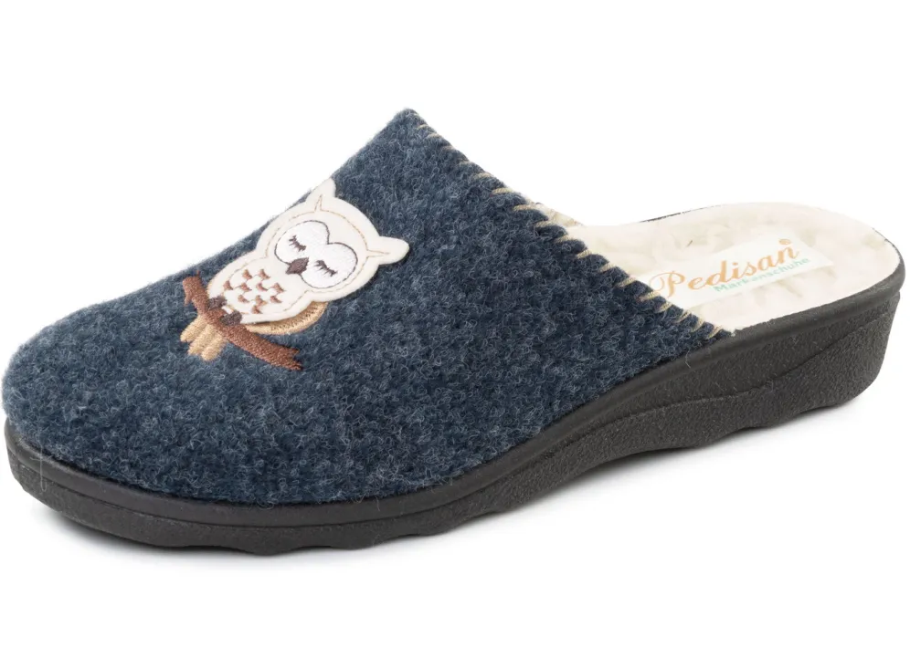 Hausschuhe aus weichem Filz mit niedlicher Eulen-Applikation: Warmfutter und Fußbettbezug aus reiner Schurwolle, superleichte Synthetik-Laufsohle sowie 20 mm Keilabsatz