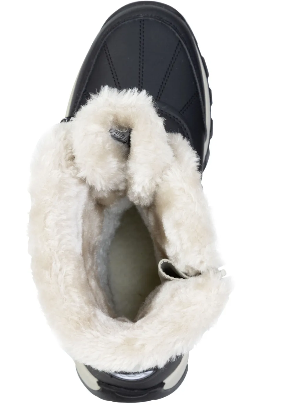 Stiefel in Ecru-Schwarz aus Textil und Synthetik im Materialmix, mit Schnürung, Innenreißverschluss und Plüschkragen: mit Klimamembrane ausgestattet, molliges Warmfutter aus 100% Polyester, herausnehmbare Decksohle, leichte CME-Profilsohle sowie 15 mm Keilabsatz. Schafthöhe ca. 22 cm