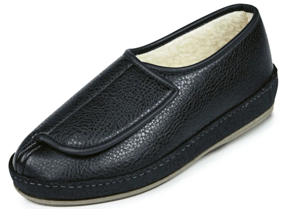 Mit weit zu öffnenden Klettverschlüssen, pflegeleichter abwaschbarer Oberfläche und warmem Innenfutter. Ideal als Verband- oder Therapieschuh sowie z. B. für Rollstuhlfahrer geeignet. Mit durchgehender Filzschalensohle. Obermaterial Lederimitat, Decksohle und Innenfutter aus 100% Schurwolle. PVC- Laufsohle mit verbreiterter Auftrittsfläche für sicheren Stand.