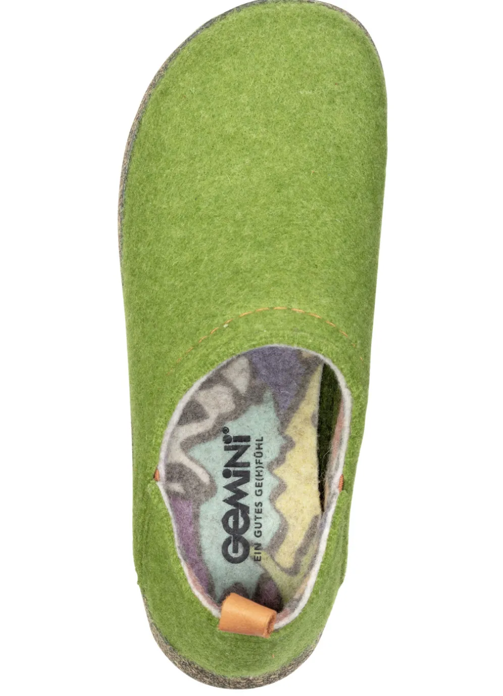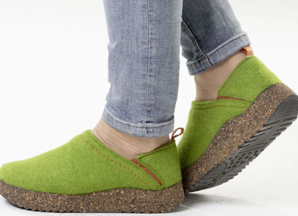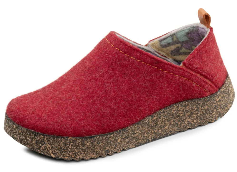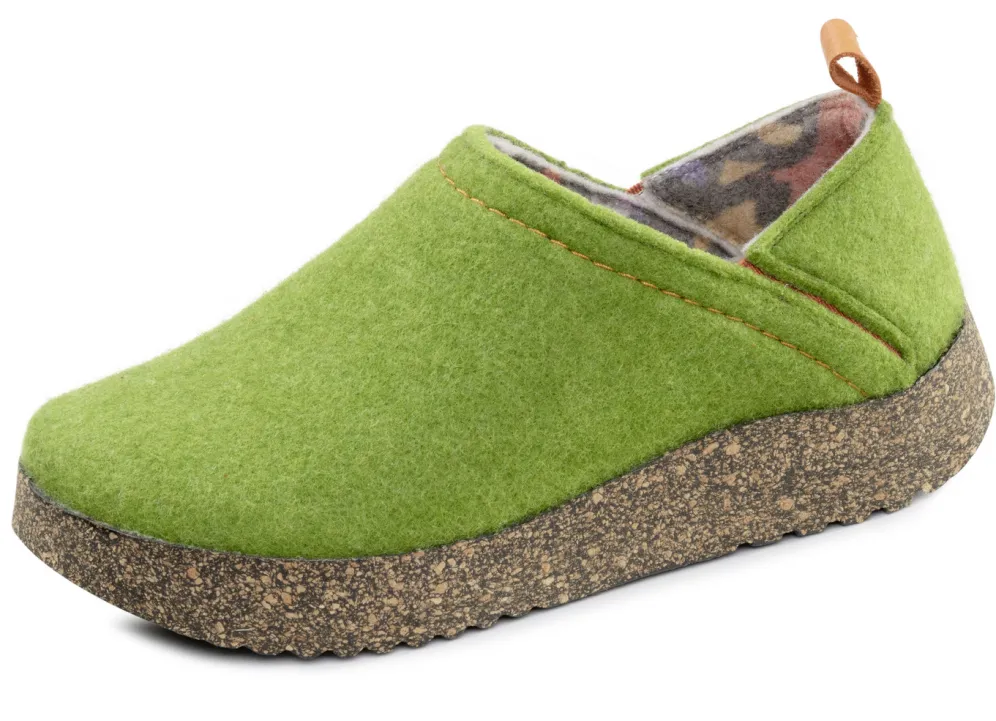 Hausschuhe aus Wollfilz mit kontrastfarbenen, seitlichen Gummizügen. Fersenbereich kann nach unten geklappt werden, sodass der Hausschuh als Clog getragen werden kann. Weite G, herausnehmbares Fußbett, leichte PU-Laufsohle mit Kork sowie 10 mm Keilabsatz