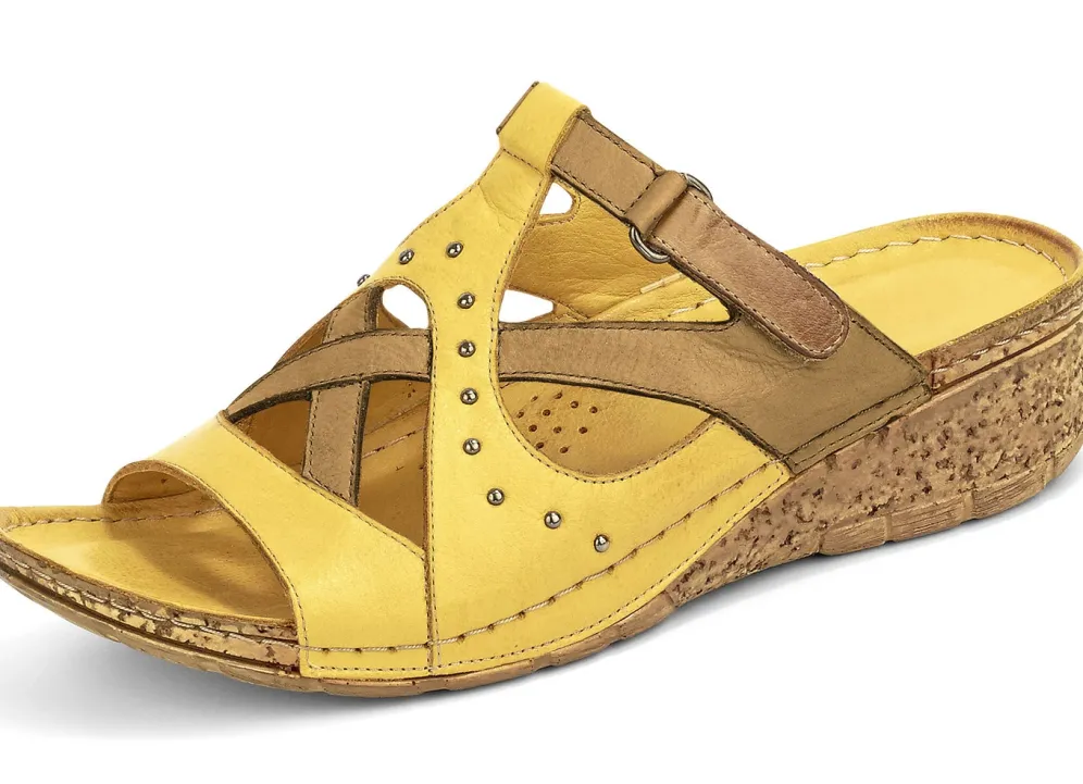 Gemini Pantolette mit Nietenzier in Gelb-Cognac und in Größe 41.
