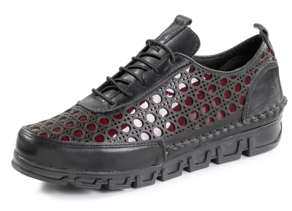 Außergewöhnlicher Schnürschuh aus gelochtem Nappaleder, mit glänzendem Lackleder unterlegt: Weite G, Textilfutter, herausnehmbares Lederfußbett, leichte TR-Profilsohle sowie 10 mm Keilabsatz