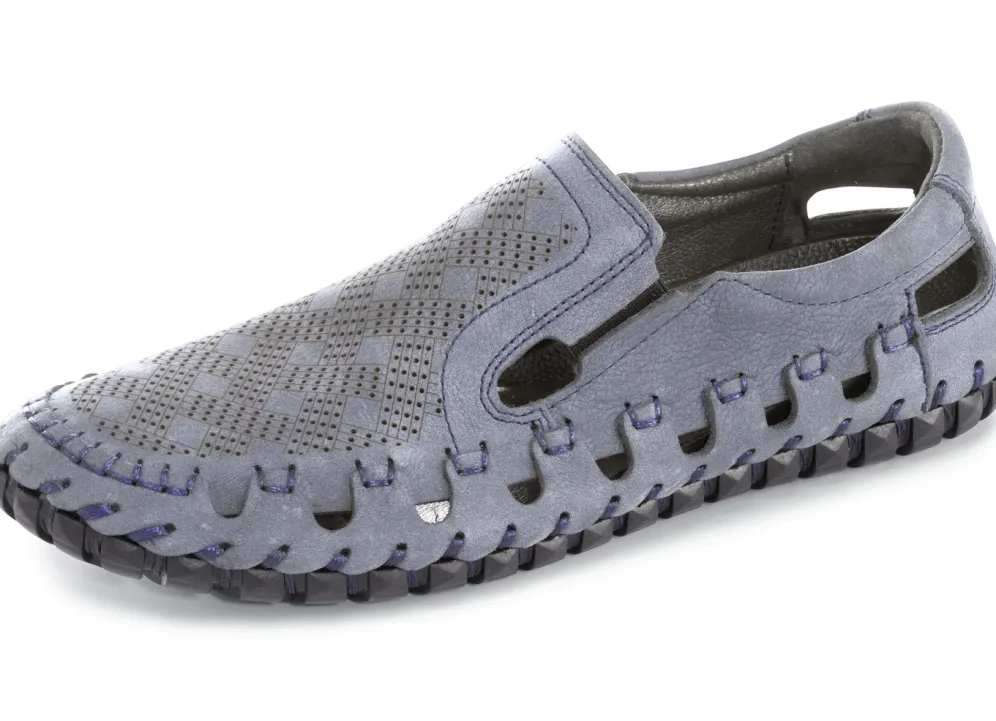 Luftige Slipper aus geprägtem Rind-Nubukleder: zwei seitlich eingesetzte Gummizüge, Quartier mit Lederfutter, gepolstertes Lederfußbett sowie handgenähte Gummi-Profilsohle