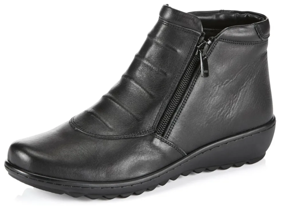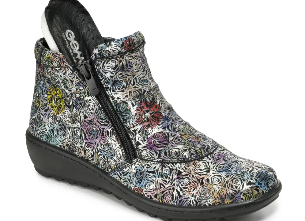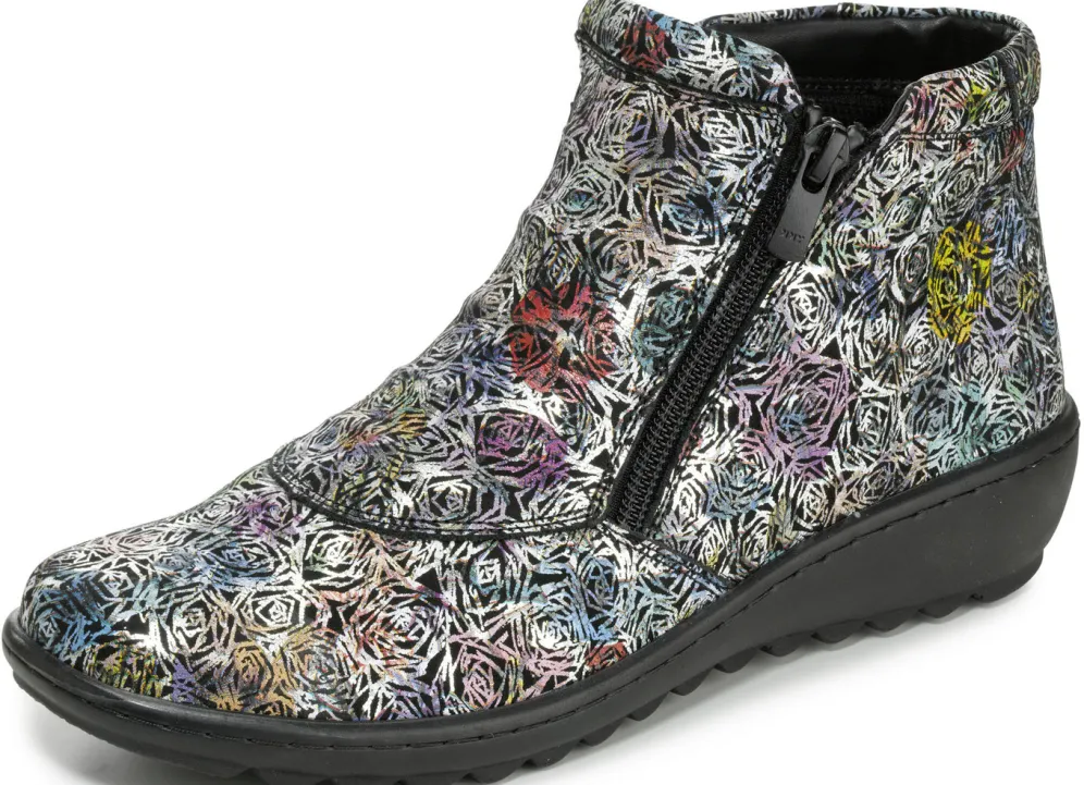 Stiefelette aus Rind-Nappaleder, in Schwarz-Bunt mit interessanter Metallic-Prägung: Weite G, zwei Seitenreißverschlüsse, gepolstertes Textilfutter, herausnehmbares Lederfußbett, superleichte PU-Profilsohle, 30 mm Keilabsatz. Schafthöhe ca. 9 cm