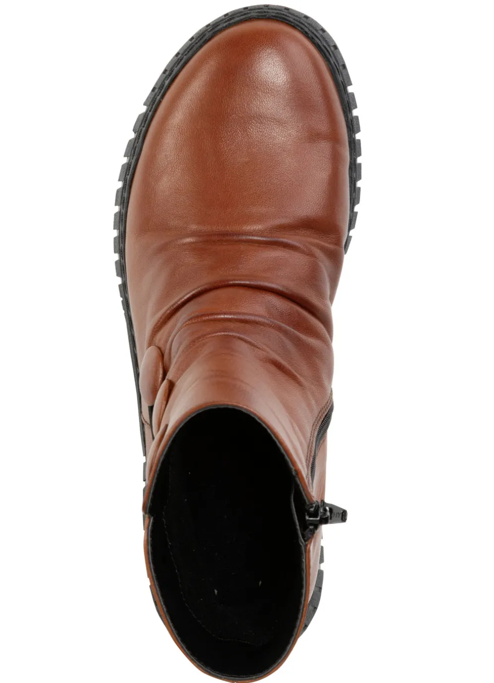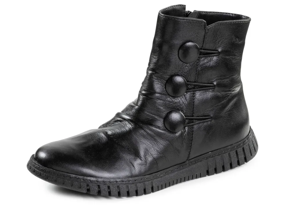 Stiefelette aus weichem Rind-Nappaleder, mit Raffung und dekorativen Knöpfen: Weite G, Innenreißverschluss, wärmendes Textilfutter, herausnehmbares Fußbett, leichte Gummilaufsohle, 10 mm Keilabsatz. Schafthöhe ca. 14 cm