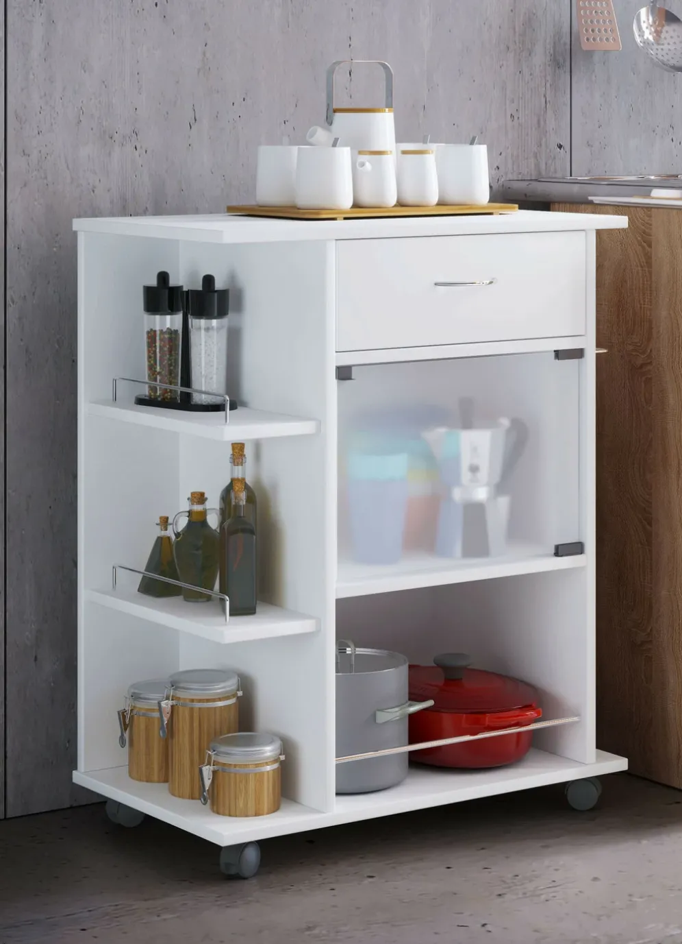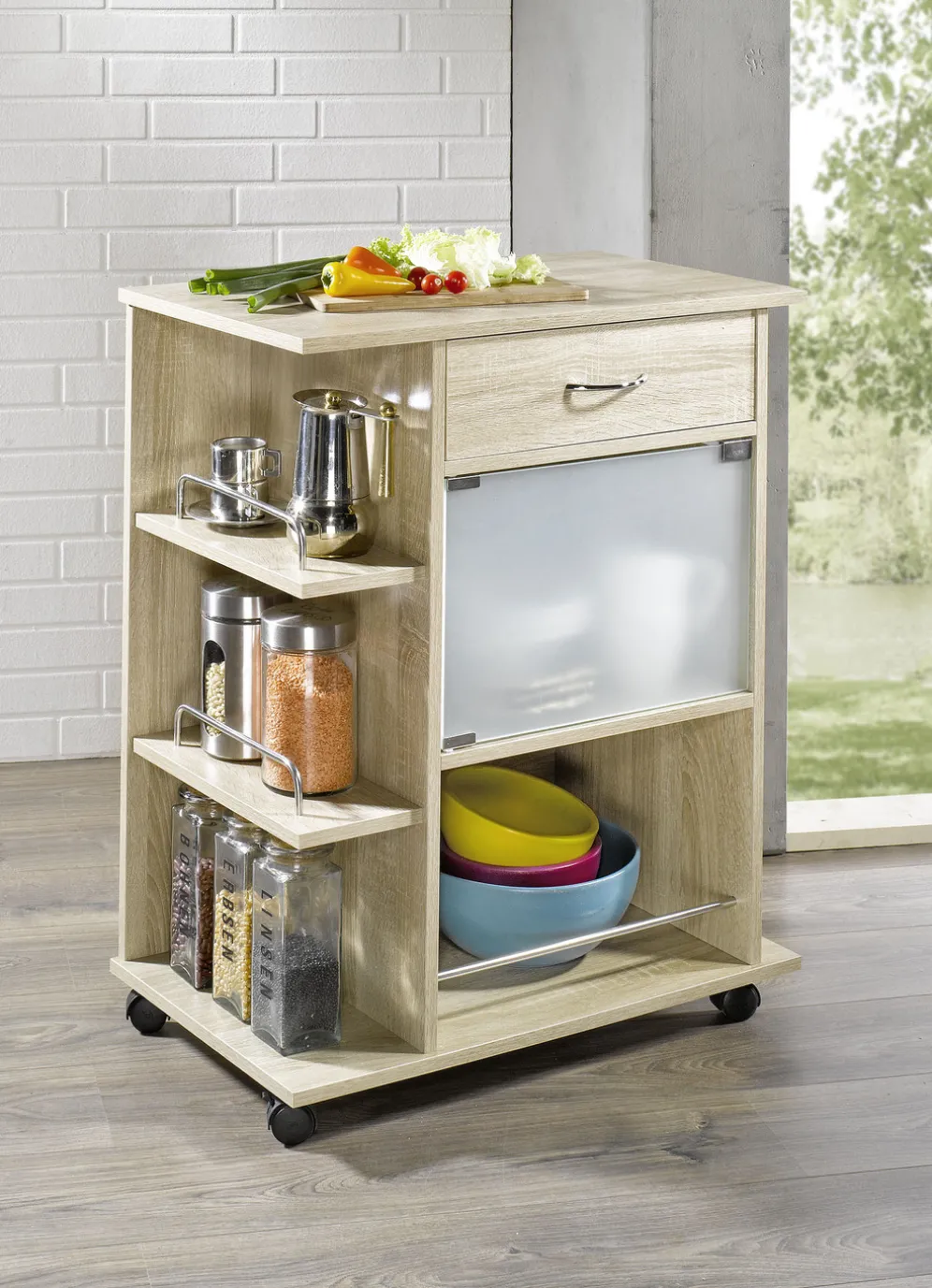 Nützlicher, geräumiger Küchenrollwagen in Holzstruktur-Nachbildung mit pflegeleichter Melaminbeschichtung sorgt für ausreichend Stauraum in Ihrer Küche. Mit 4 offenen Fächern (3 kleine, 1 großes), 1 Fach mit edler Mattglastür, 1 großen Schublade, 4 Rollen, sowie silberfarbenen Edelstahlgriffen. Mit Aufbau-Anleitung.