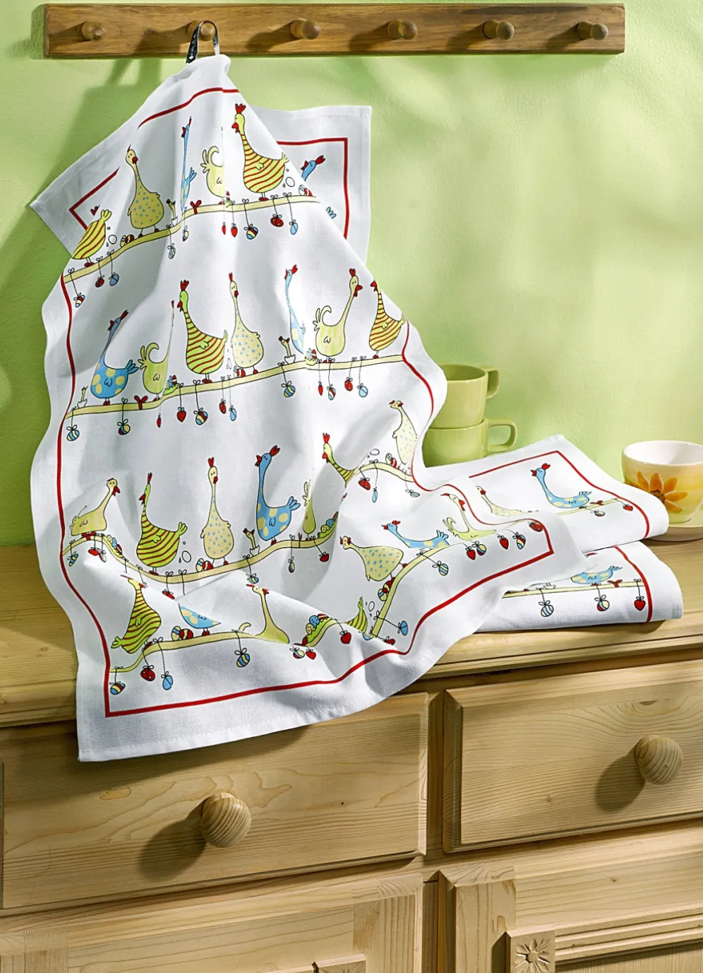 Geschirrtücher, 3er-Set Einfach zum Schmunzeln sind die Hühner auf der Stange, die als Motiv auf diesen hochwertigen Geschirrtüchern abgebildet sind.