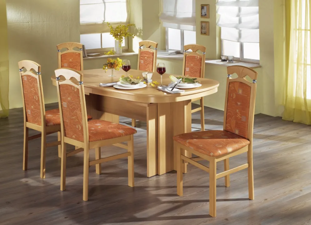 Sehr schöner Kulissentisch mit 3 innenliegenden Einlagen à 40 cm. Melaminharzbeschichtete Oberfläche in Buche-Dekor.