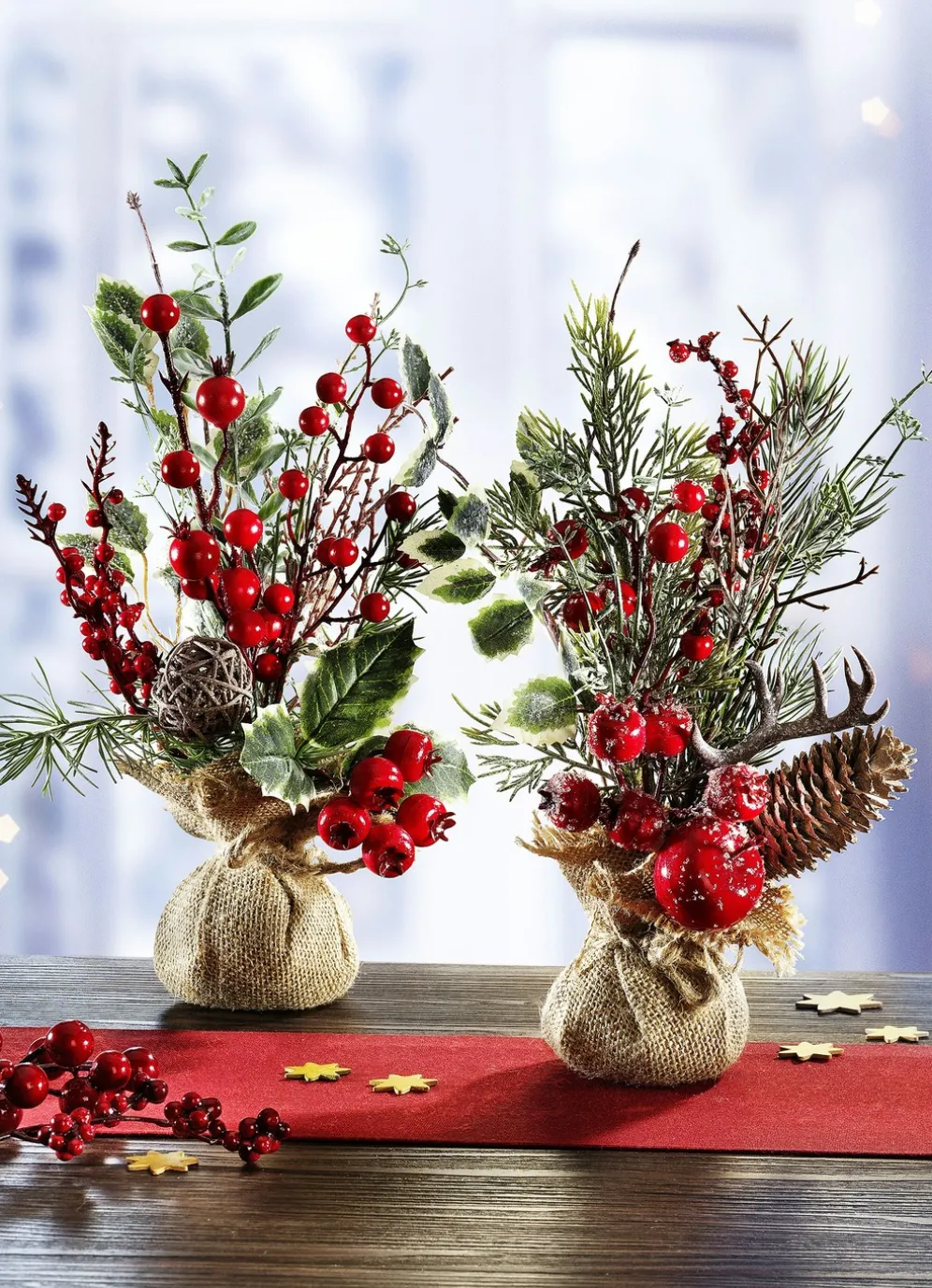 Gesteck im Jutesäckchen, 2er-Set in Grün-Rot.