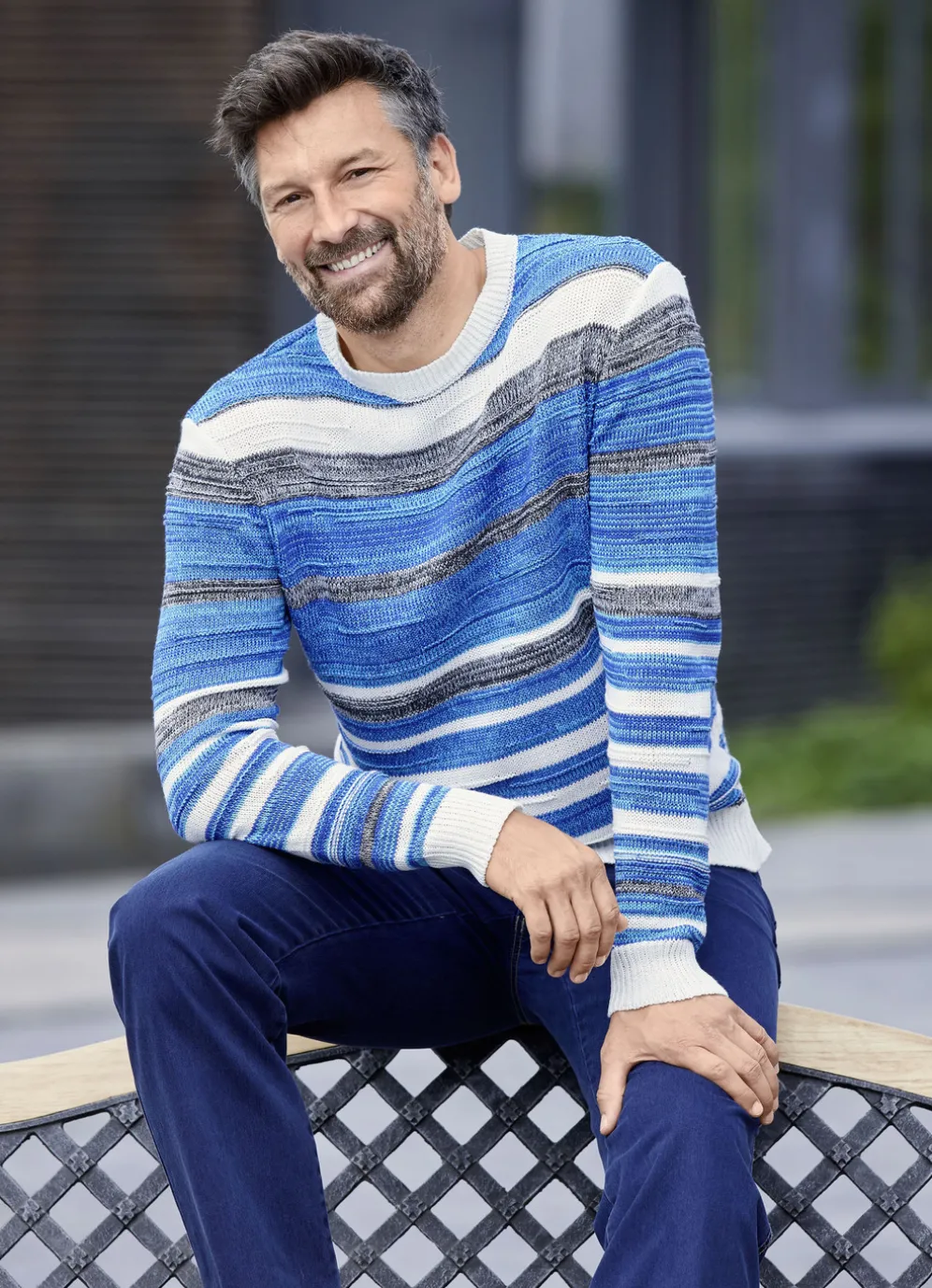 Empfohlen für lässige Auftritte ist dieser türkisgrau- ecru gestreifte Rundhalspullover mit gemustertem Strukturdessin allover sowie Rippenstrick- Abschlüssen.
