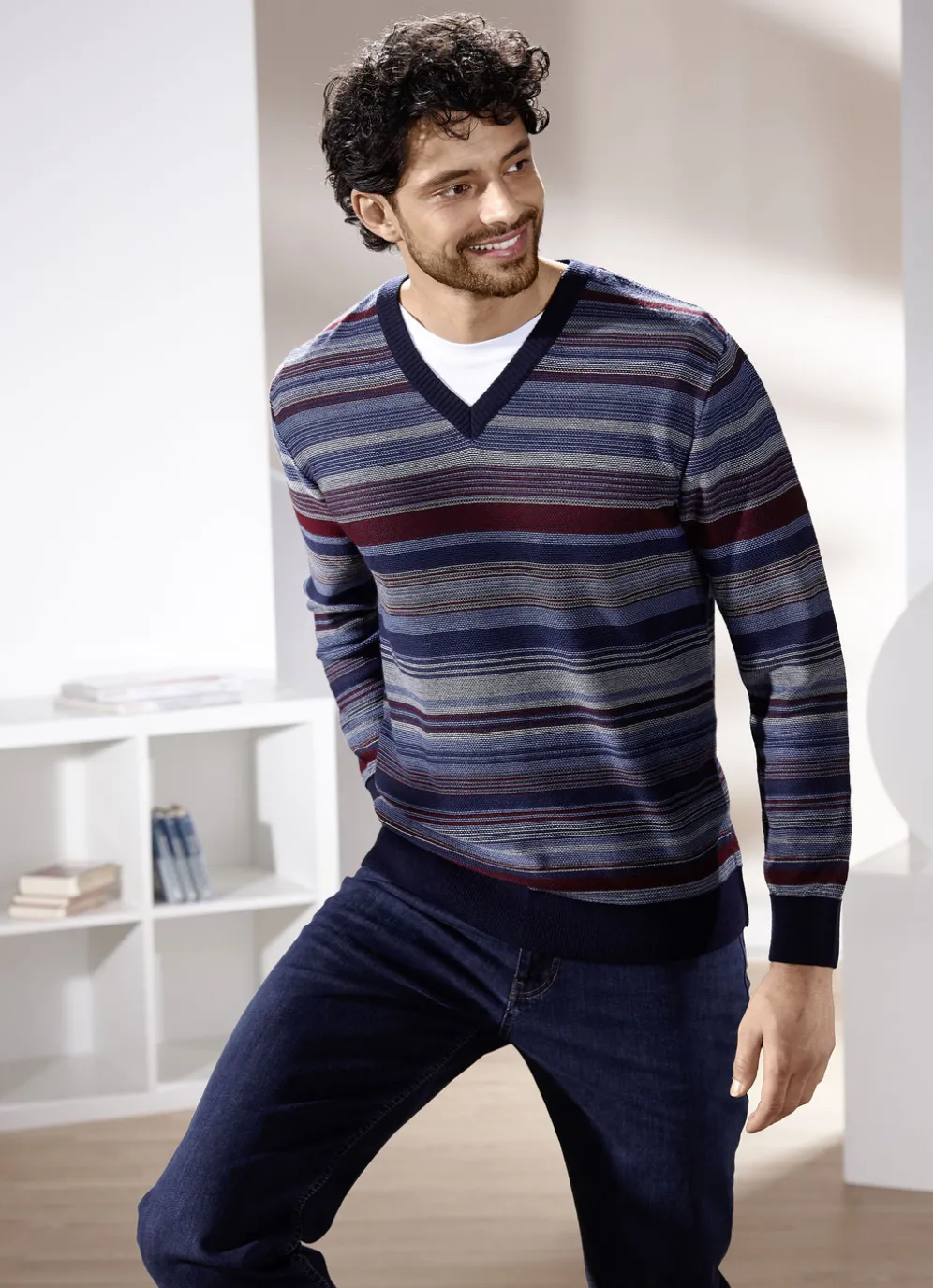 Gestreifter V-Pullover in 2 Farben in Jeansblau-Bordeaux und in Größe 46.