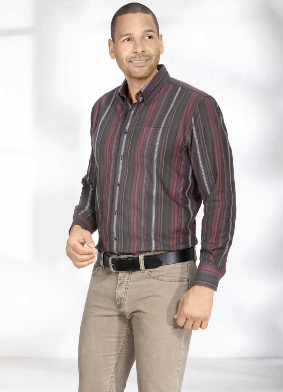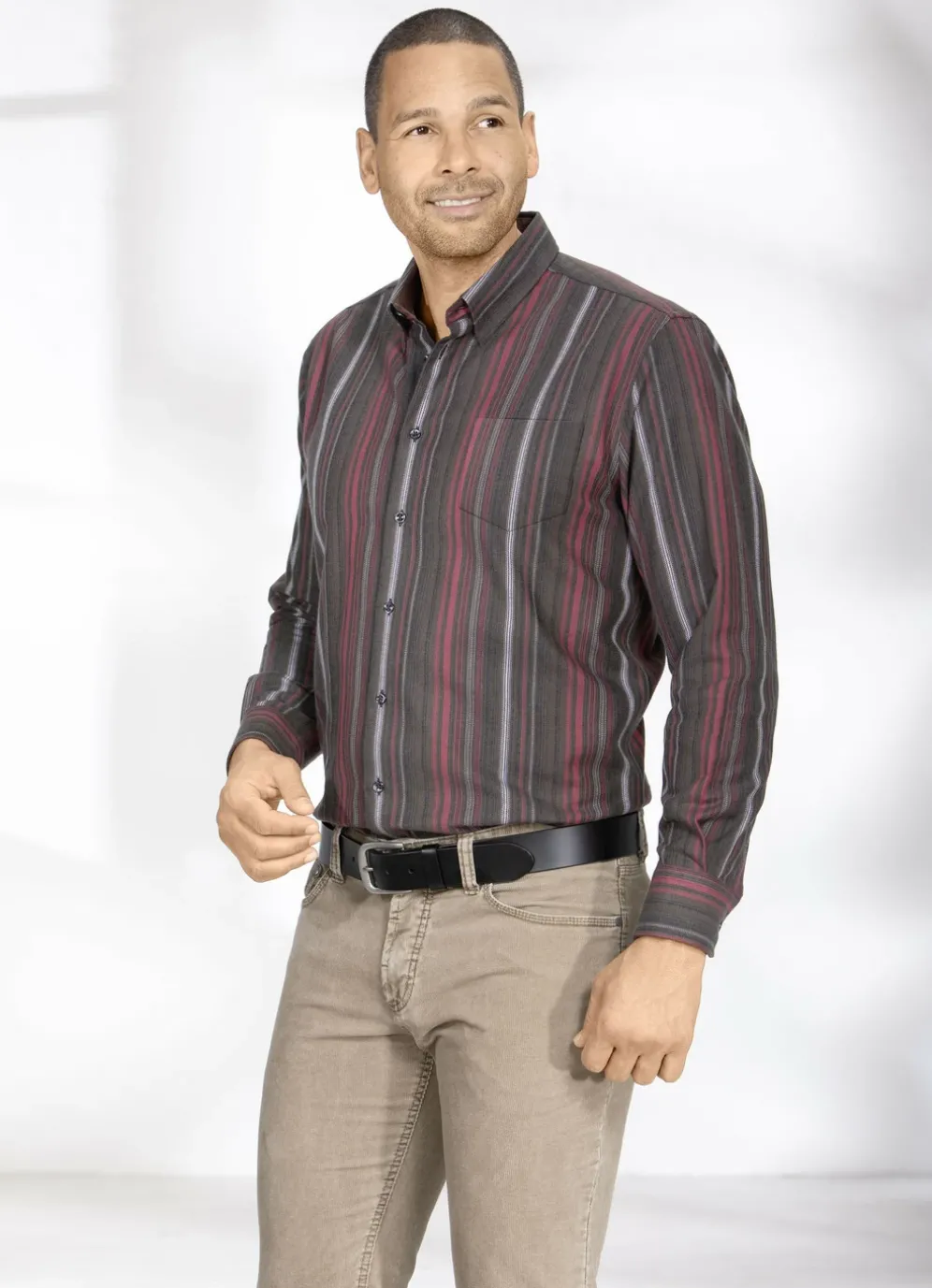 Braun-Rot-Weiß gestreiftes Hemd mit Brusttasche, Ärmelschlitzbesatz mit extra Knopf, Manschetten mit Verstellknopf sowie Rückenpasse. Kragen- und Manschetteninnenseite mit Cordbesatz.