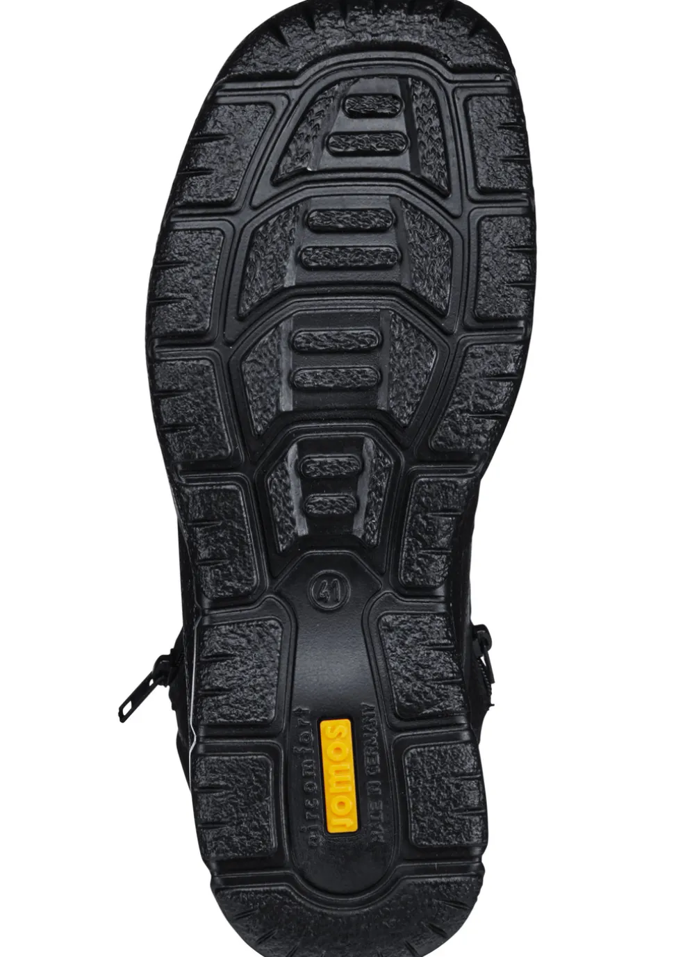 Schwarze Boots von GINO GALANTE, aus genarbtem Rind-Fettleder: zwei seitliche Reißverschlüsse, echtes Lammfellfutter bis zur Spitze, herausnehmbare Decksohle sowie PUR-Luftpolster-Profilsohle. Schafthöhe ca. 13 cm