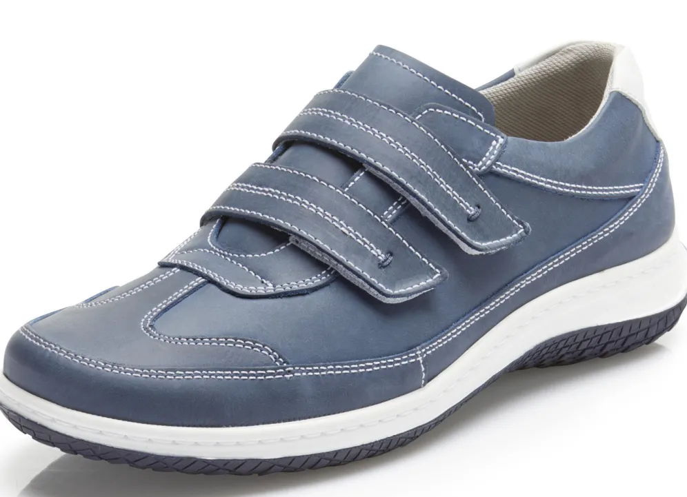 Sneaker von GINO GALANTE in Jeans-Weiß, aus schattiertem Rindleder: zwei verstellbare Klettspangen, Textilfutter, herausnehmbares Fußbett sowie leichte PU-TPU-Riffelsohle