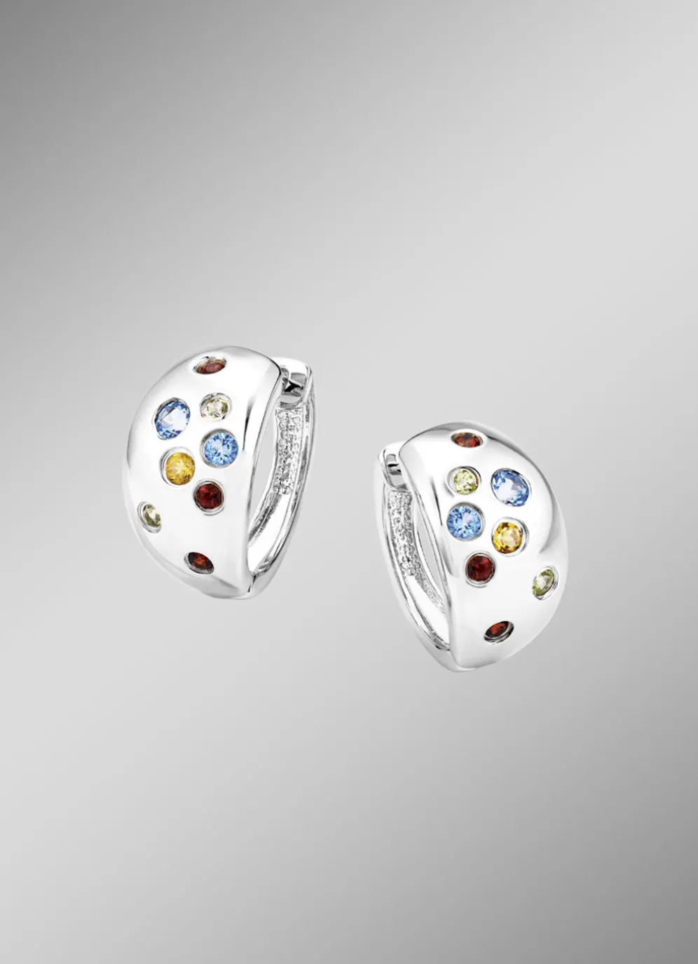 Entdecken Sie die strahlende Schönheit dieser Klappcreolen aus Silber 925/- fein, rhodiniert für eine glänzende und langlebige Oberfläche. Diese Creolen, mit den Maßen 9×17 mm, sind mit echten Edelsteinen – Citrin, Peridot, Granat und Baby-Blautopas, beh. – besetzt, die in ihrer Farbvielfalt und Brillanz beeindrucken.