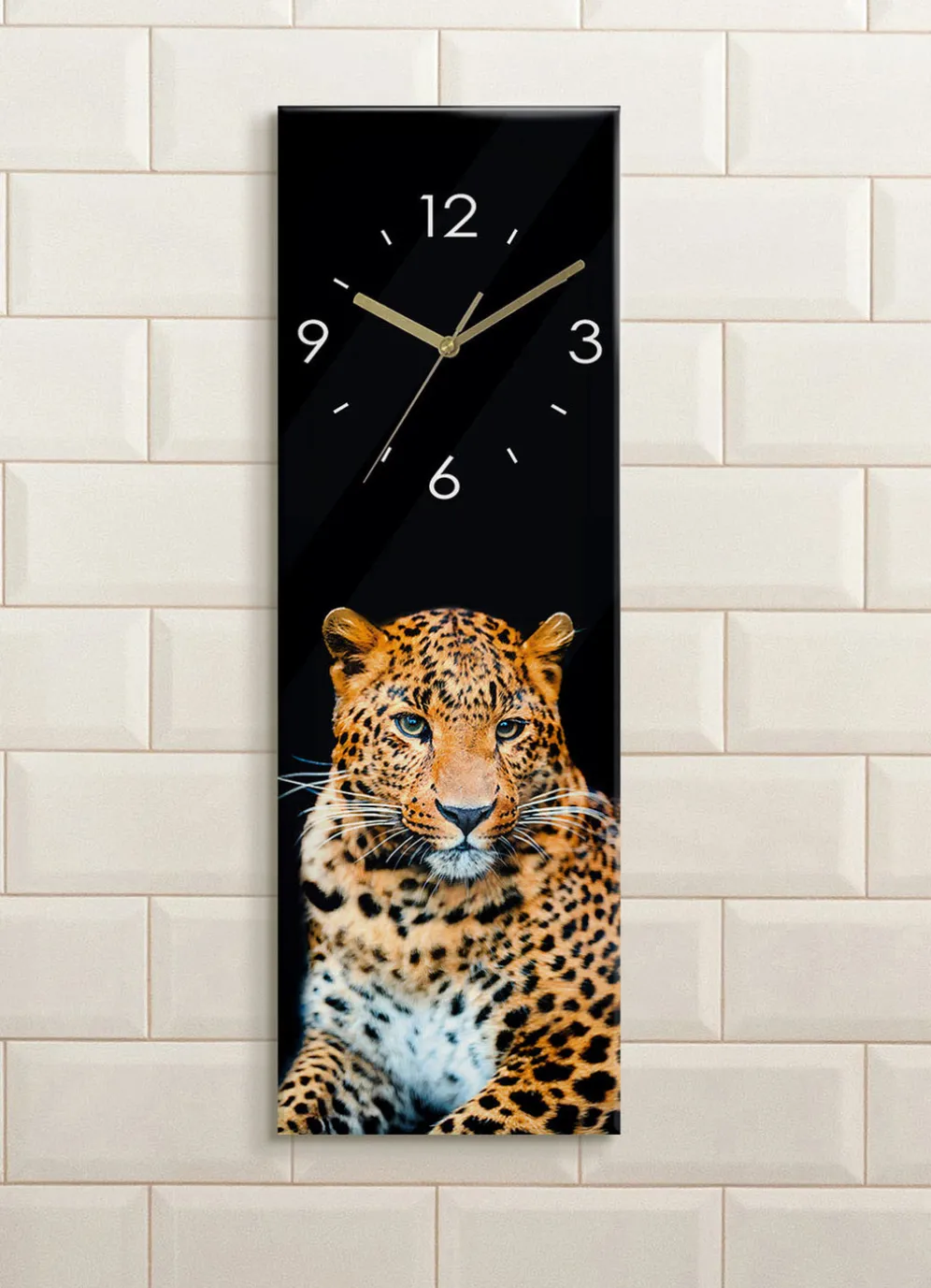 Ein faszinierender Hingucker für Ihren Wohnbereich! Diese Wanduhr wurde mit einem Leoparden-Motiv gestaltet. Anmutig hat er alles genauestens im Blick. Vom Künstler Volodymyr Burdiak mit dem Titel „Wütender, wilder Leopard auf schwarzem Hintergrund“. Im Digitaldruck auf Float-Glas gedruckt. Mit goldenen Zeigern und weißen arabischen Ziffern.