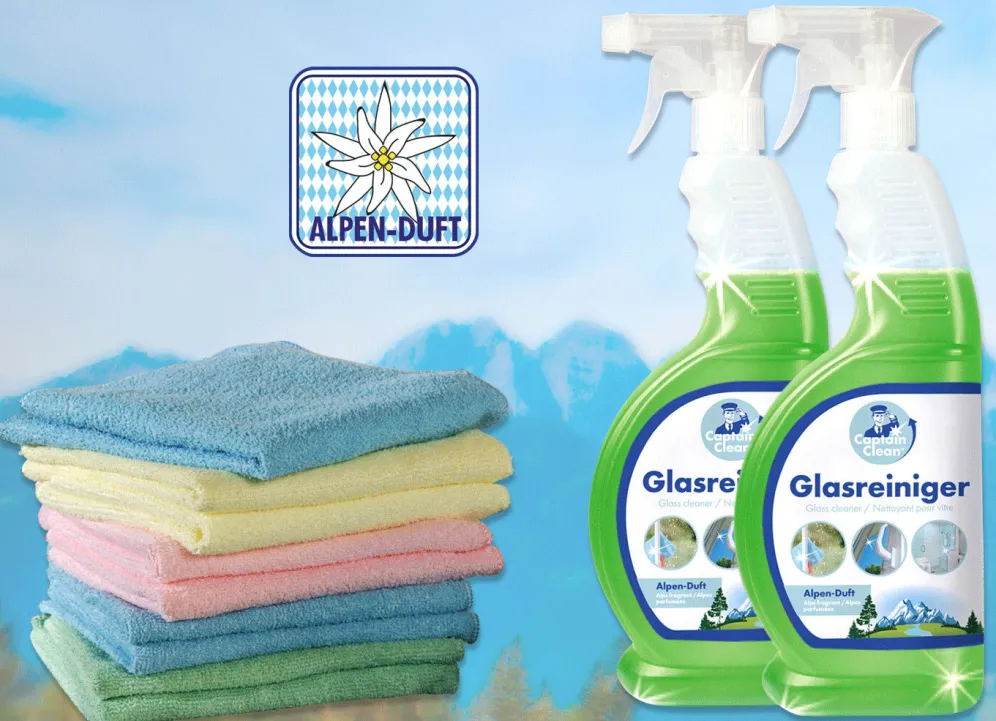 Dieser magische Glasreiniger reinigt Fenster und Spiegel gründlich und streifenfrei. Zurück bleibt ein herrlich frischer Duft. Sie sparen viel Zeit und Mühe. Set aus: 2x Glasreiniger Alpenduft 650 ml und 10 Mikrofasertüchern (100% Polyester). Für alle Oberflächen geeignet – super saugstark, antistatisch und fusselfrei.