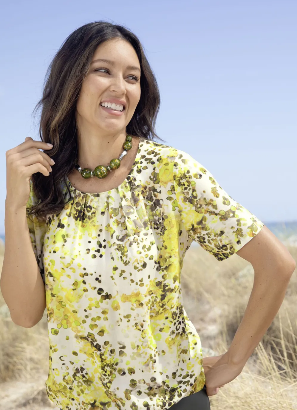 Gliederkette mit Perlen in Oliv-Gelb-Silber.