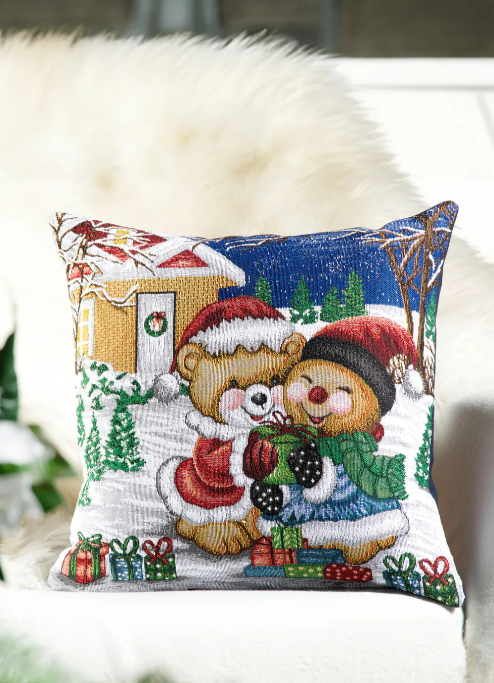 Die süßen Teddys auf diesem Kissenbezug kuscheln ganz verträumt miteinander. Mit Reißverschluss gefertigt. Gobelin, 65% Baumwolle, 35% Polyester.