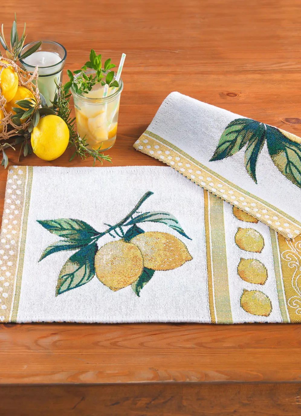 Frische Zitronen schmücken dieses praktische 2-teilige Platz-Set. Die Qualität: Gobelin aus 65% Baumwolle und 35% Polyester. Waschbar bis 30 °C. Maße: je 33×50 cm.