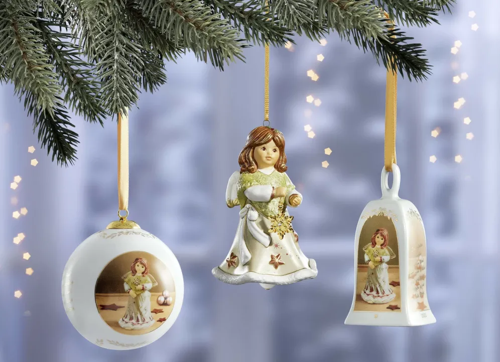 Jahreskugel 2022: Aus Porzellan gefertigt. Mit Motiv „Jahresengel 2022“ und Echtgold-Auflage. Maße: ø 7,5 cm, Höhe 8 cm, Länge ca. 18 cm