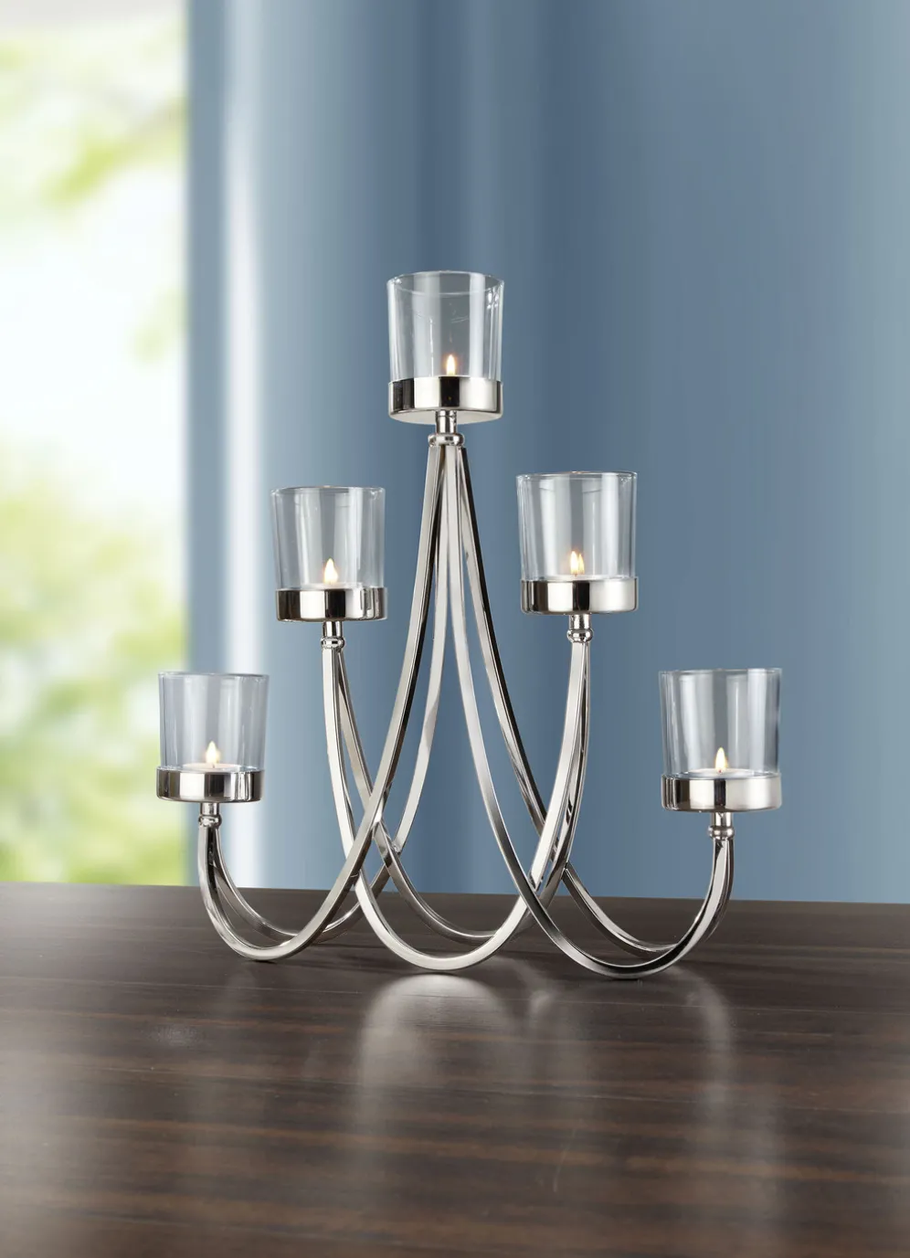 Dieser elegante Kerzenleuchter wird Sie begeistern! Mit 5 Teelichtgläschen passend für 5 Teelichter. Teelichter nicht im Lieferumfang enthalten. Im traditionsreichen Hause „Goebel“ liebevoll aus hochwertigem Metall gefertigt. Maße: B40,5xH35xT9 cm.