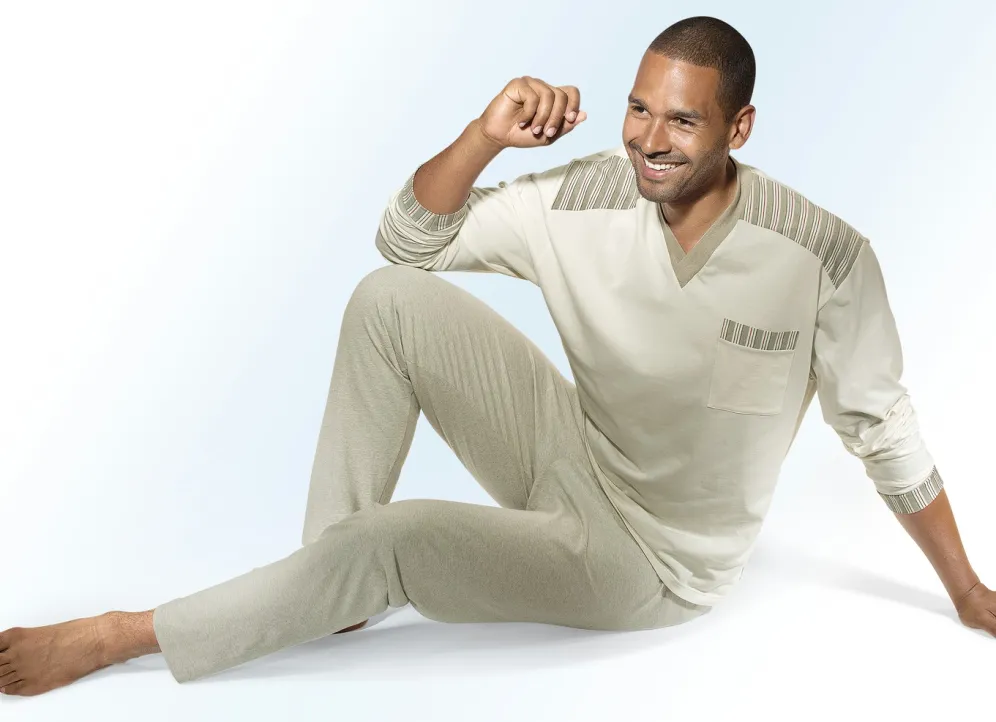 Götting Schlafanzug mit V-Ausschnitt, Naturfaser in Ecru-Reseda Mel und in Größe 48.