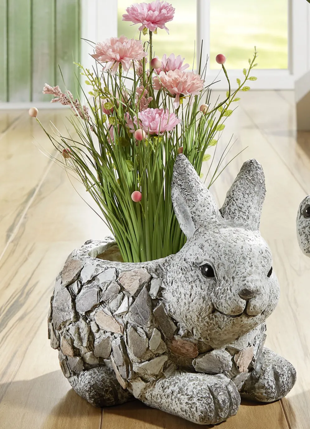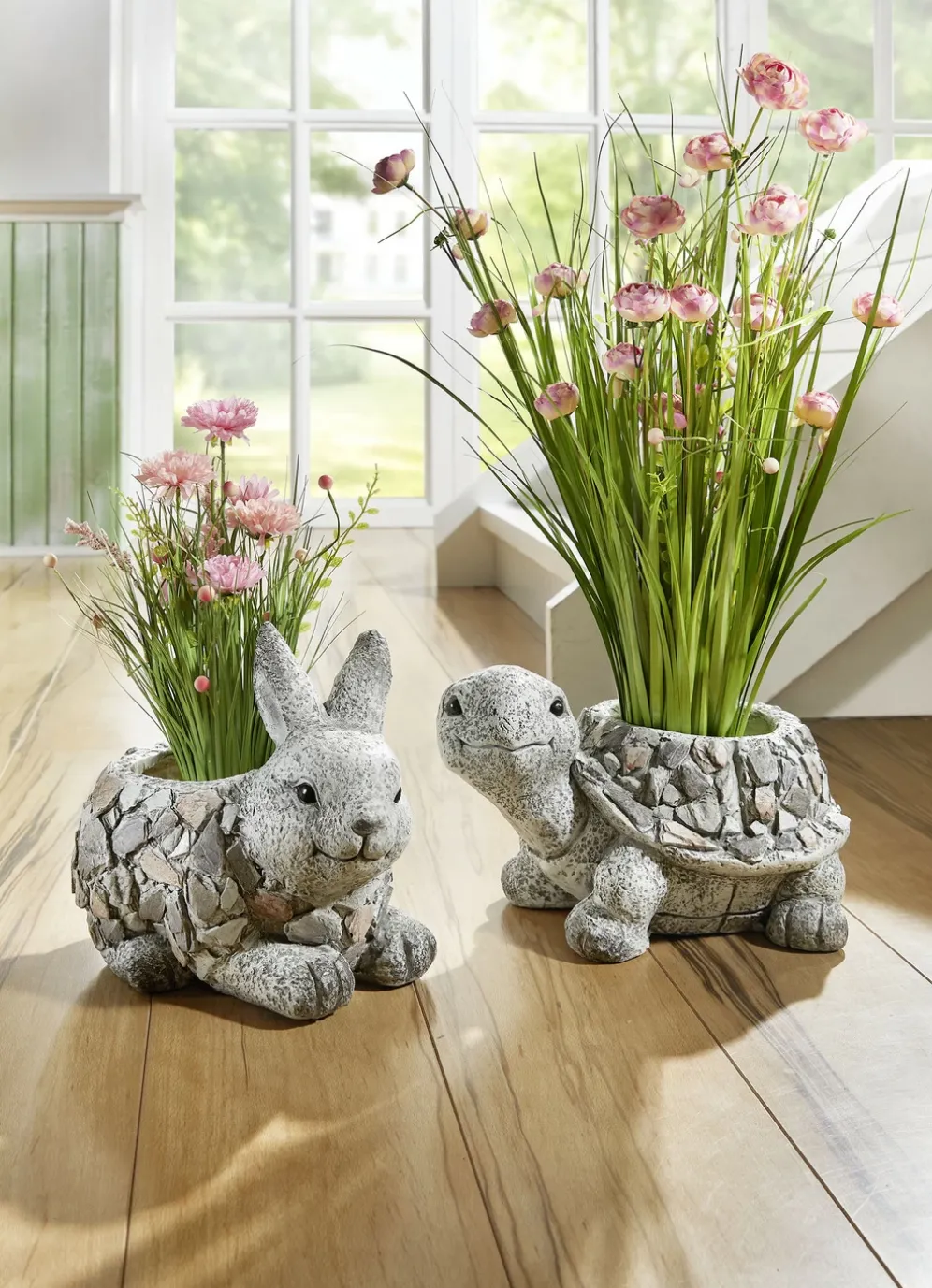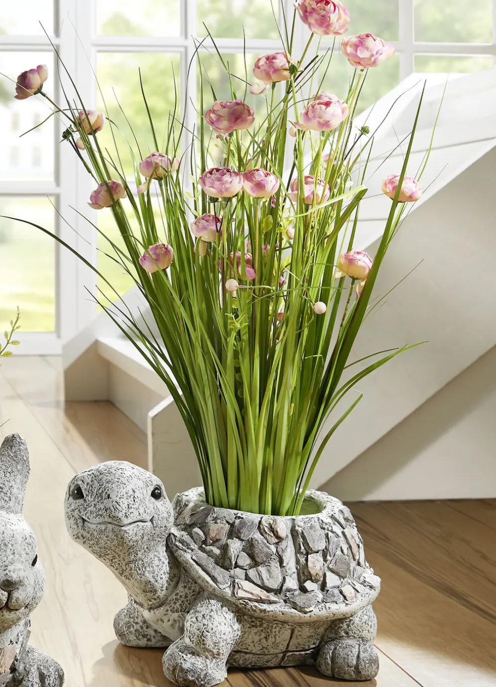 Grasbund, groß: Mit Ranunkel-Blüten. Im Topf in Form einer Schildkröte. Maße: ca. B35xH75xT30 cm