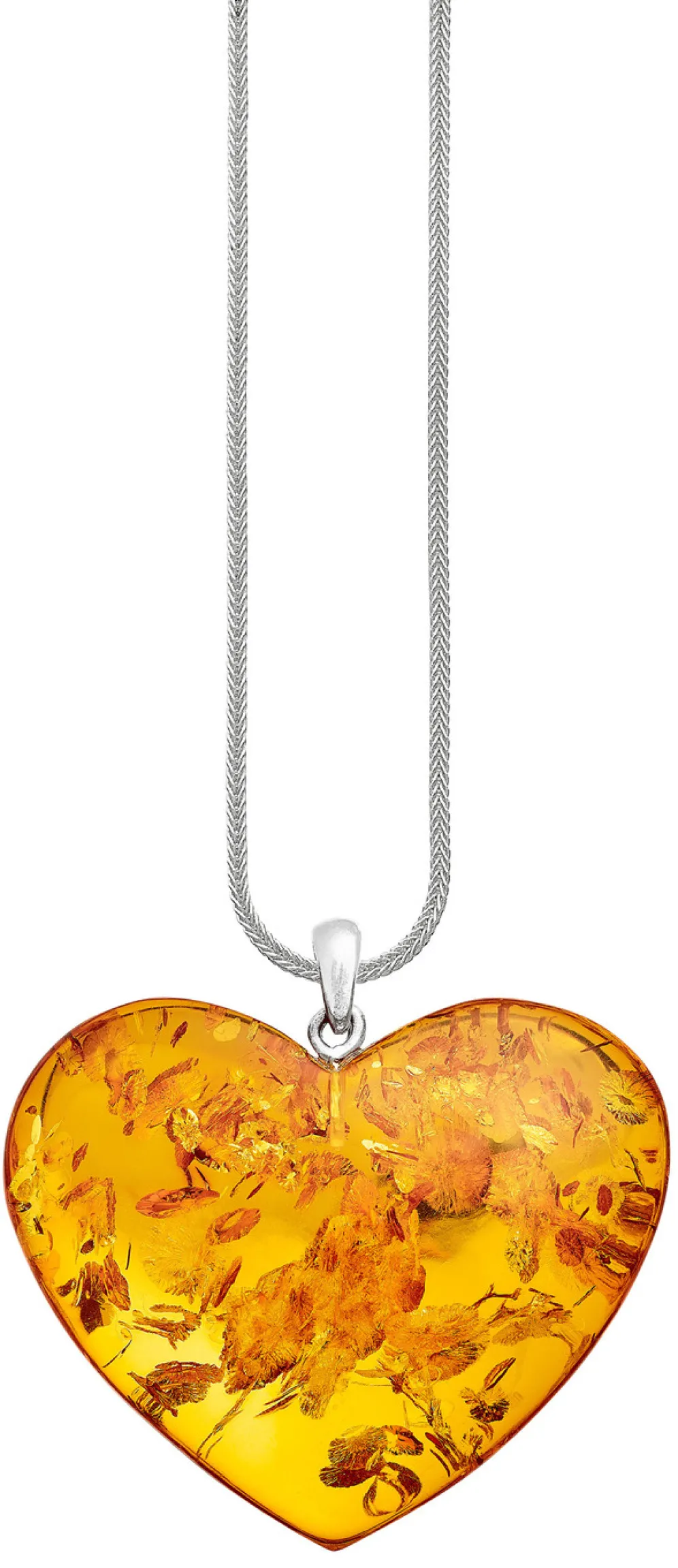 Stein ist Schmuck der Natur. Deshalb ist jedes Stück ein Unikat. Großer Herz-Anhänger, 35×39 mm, aus echt Bernstein mit einer Öse aus Silber 925/- fein. Der Bernstein schimmert ganz zauberhaft im Licht und verleiht Ihren Outfits eine elegante Note.