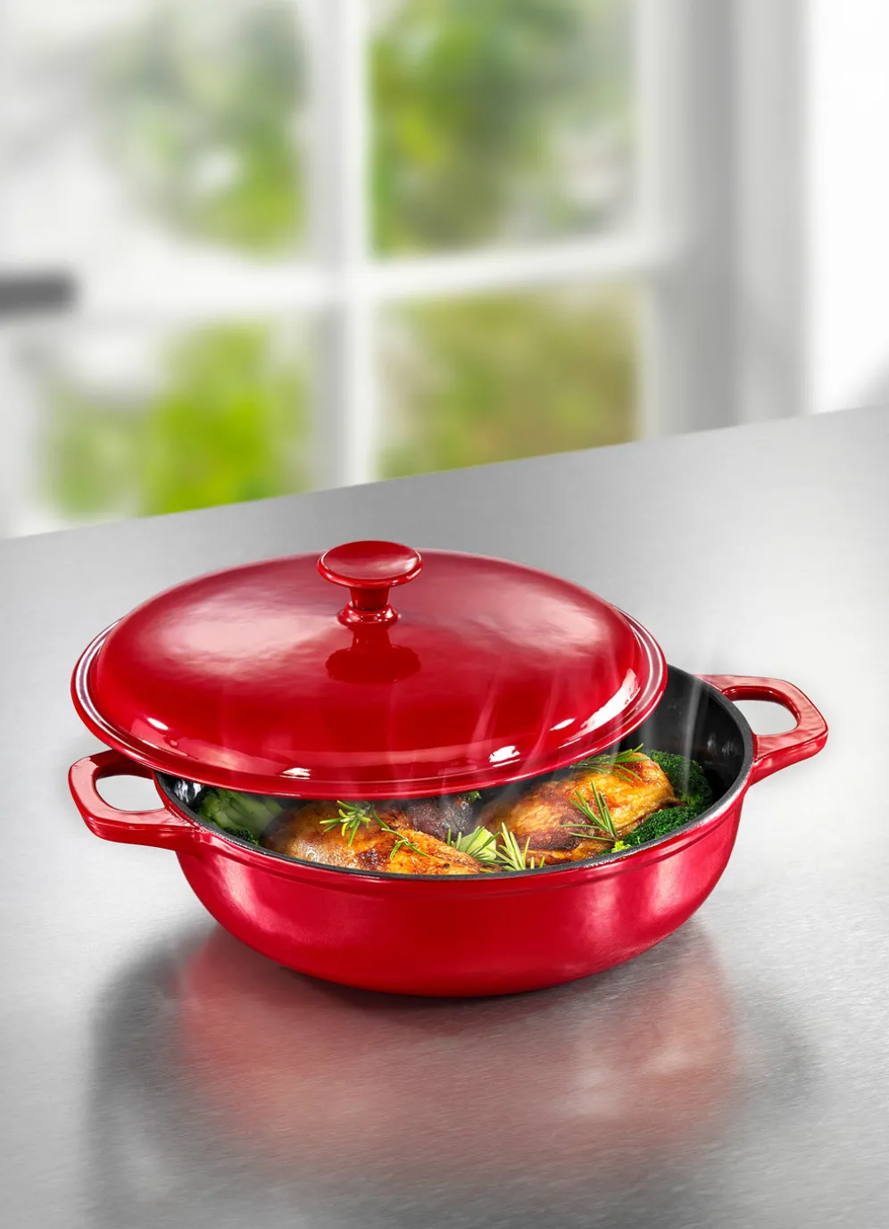 Gusseisen-Schmortopf in schwerer Ausführung für gleichmäßige Wärmeverteilung und lange Wärmespeicherung, daher energiesparend. Ideal zum scharfen Anbraten bei hohen Temperaturen sowie Schmoren bei niedriger und gleichmäßiger Wärme. Nur ganz langsam und gleichmäßig gibt der Topf die Hitze an seine Umgebung wieder ab und hält so das Essen enorm lange warm. Topf und Deckel innen pflegeleicht emailliert – für leichte Reinigung und Braten mit wenig Fett. Für alle Herdarten geeignet, auch Induktion. Backofengeeignet bis 180 °C. Maße: ø 30 cm, 4,3 Liter, 6,3 kg