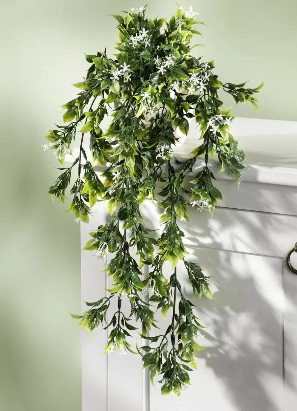 Hier kommt Natur ins Haus! Diese tolle Hängepflanze kommt vor allem auf einem Regal oder einer Kommode perfekt zur Geltung. Mit kleinen weißen Blüten. Aus hochwertigem Kunstmaterial gefertigt. Maße: Gesamtlänge 50 cm, Topf: ø 9,5 cm, Höhe 8,5 cm