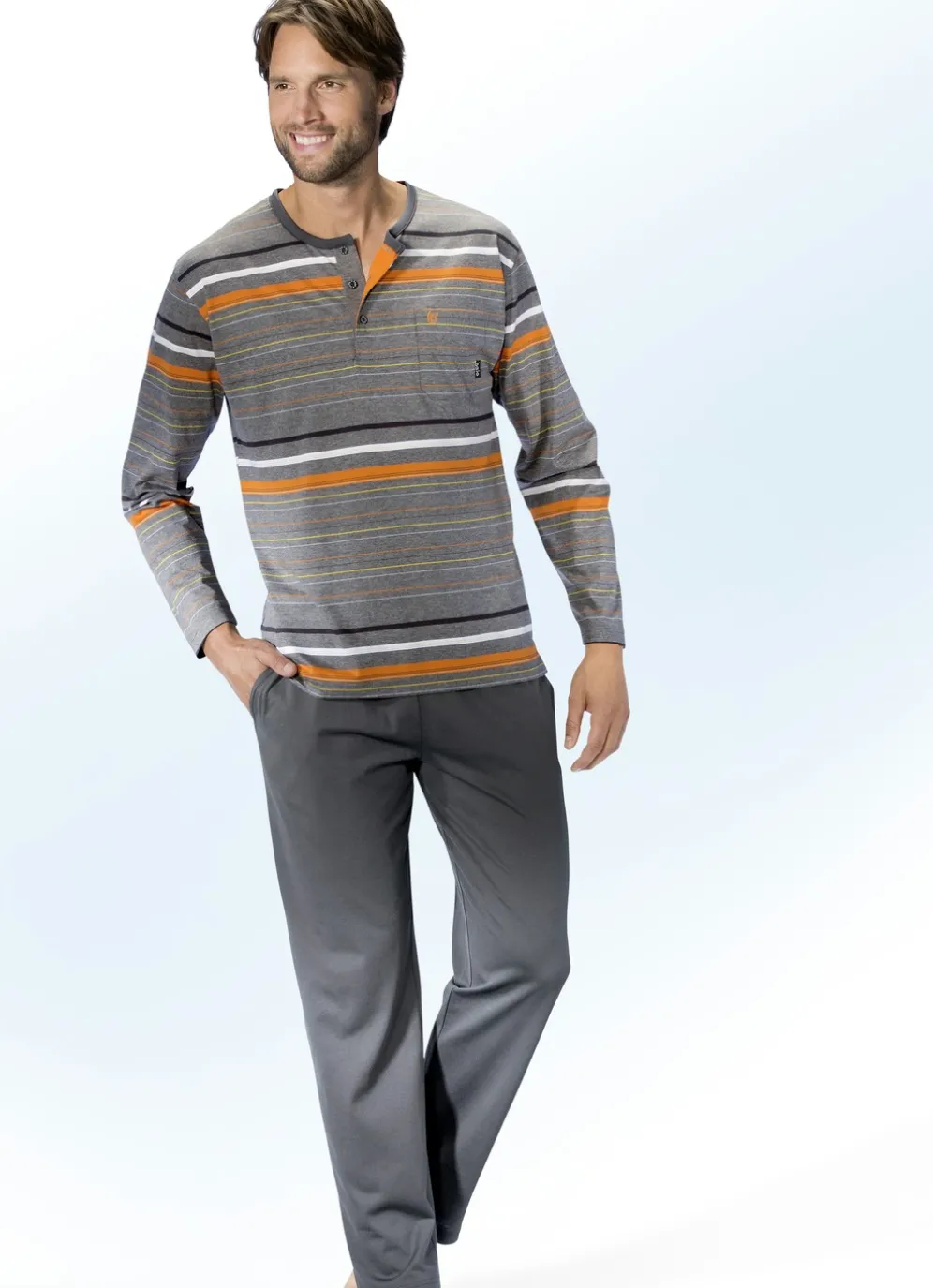 Bequemer Schlafanzug von „hajo“: Das grau meliert-orange-bunte Oberteil zeigt ein garngefärbtes Ringeldessin und ist mit Einfassung am Halsausschnitt, Knopfleiste, kleinem Stickereimotiv an der aufgesetzten Brusttasche sowie kleinen Seitenschlitzen ausgestattet. Lange, grafitfarbene Hose mit Dehnbund, Seitentaschen sowie offenen Beinabschlüssen. Die besondere Qualität: Feinjersey aus 62% Baumwolle (mercerisiert) und 38% Polyester (Microfaser)
