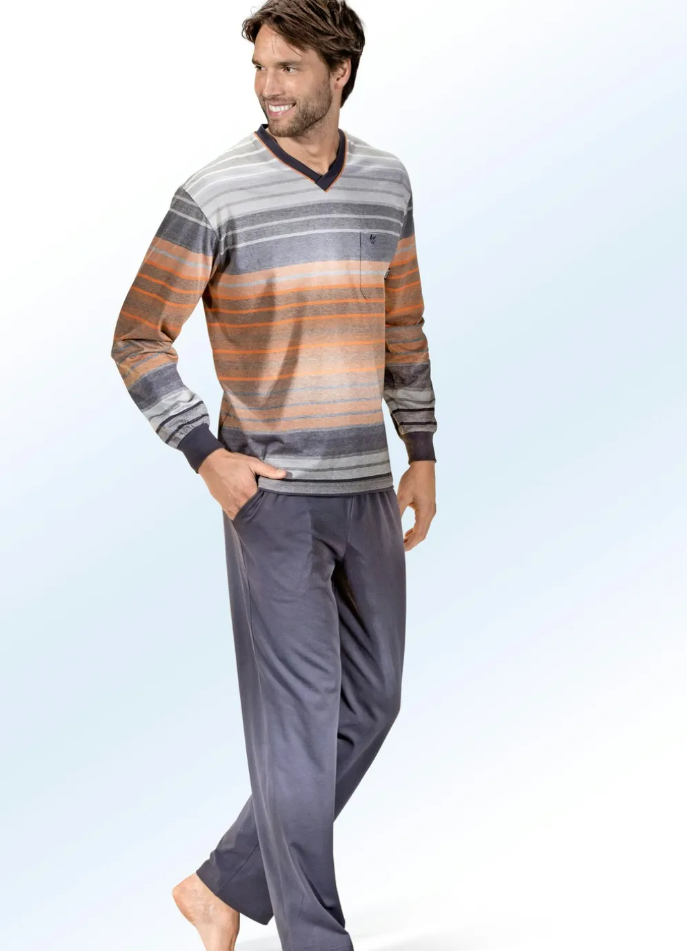 Traumhafter, bequemer Schlafanzug von „hajo“! Grafit-orange-buntes Oberteil mit garngefärbtem Ringeldessin, V-Ausschnitt, aufgesetzter Brusttasche, langen Bündchenärmeln sowie Seitenschlitzen. Lange, grafitfarbene Hose mit Durchzugsband im Dehnbund, Seitentaschen sowie offenen Beinabschlüssen.
