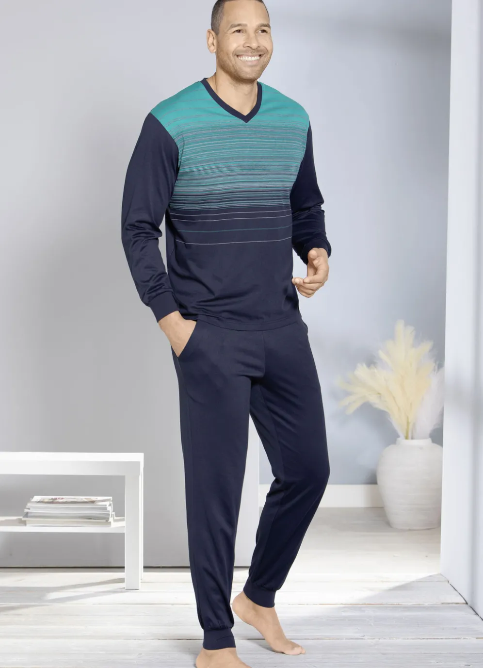 Toller „hajo“-Schlafanzug mit Bündchenabschlüssen: Oberteil mit V-Ausschnitt, garngefärbtem