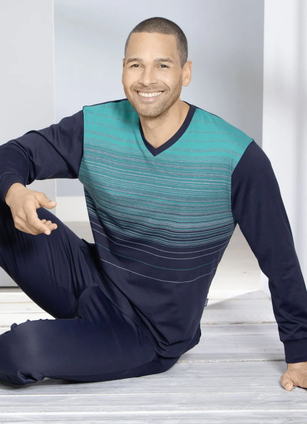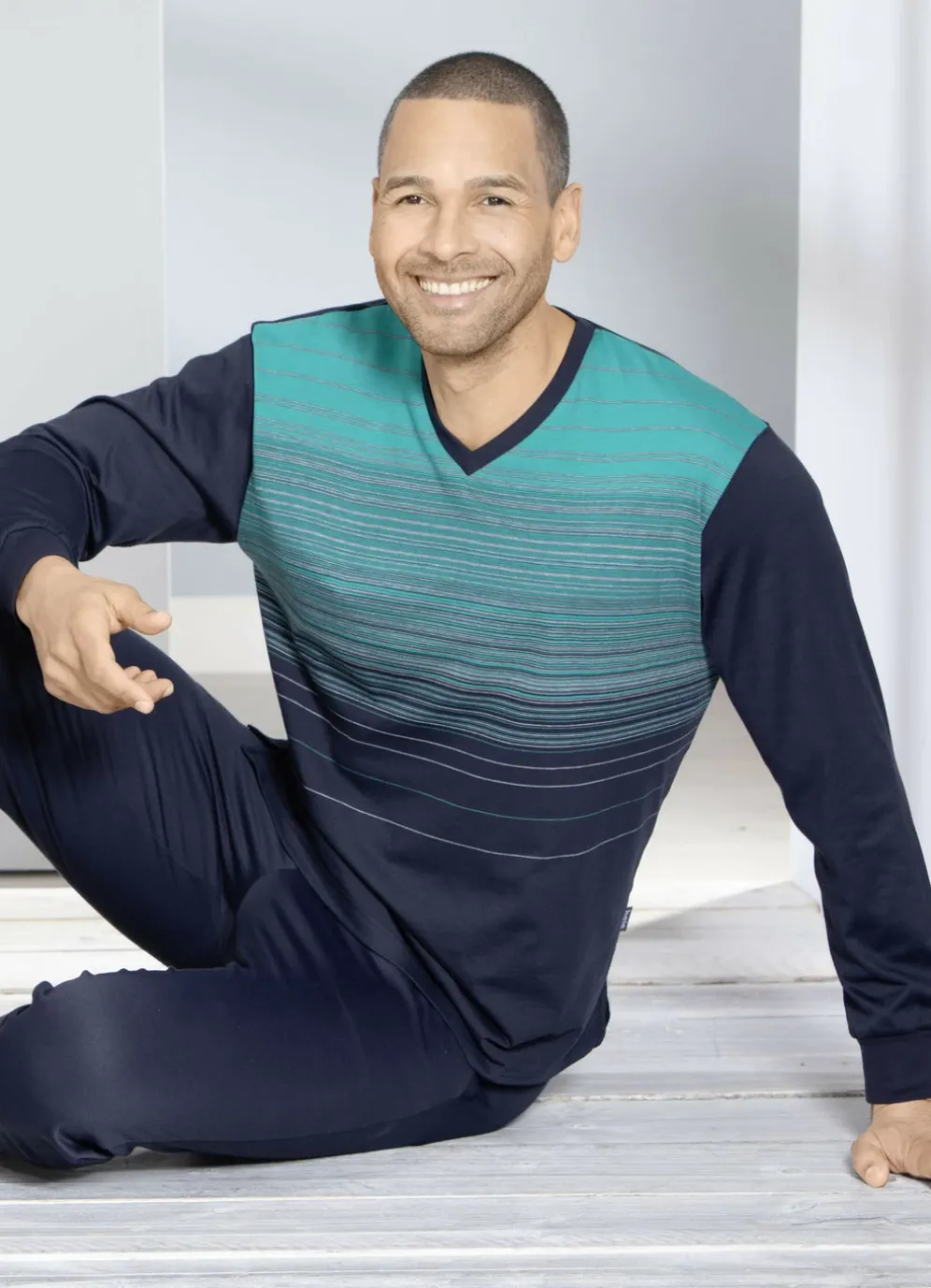 Hajo Klima Komfort Schlafanzug mit V-Ausschnitt und garngefärbtem Ringel in Marine-Smaragdgrün und in Größe 46.