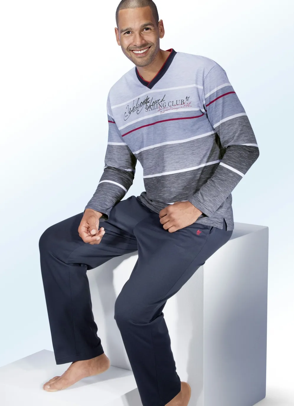 Hochwertiger „hajo“-Schlafanzug! Marine-hellblau-weißes Oberteil mit garngefärbtem Ringeldessin, V-Ausschnitt, platziertem Schriftzug im Vorderteil, Kontrastpaspel sowie kleinen Seitenschlitzen. Lange, marinefarbene Hose mit Durchzugsband im Dehnbund, Seitentaschen sowie offenen Beinabschlüssen.