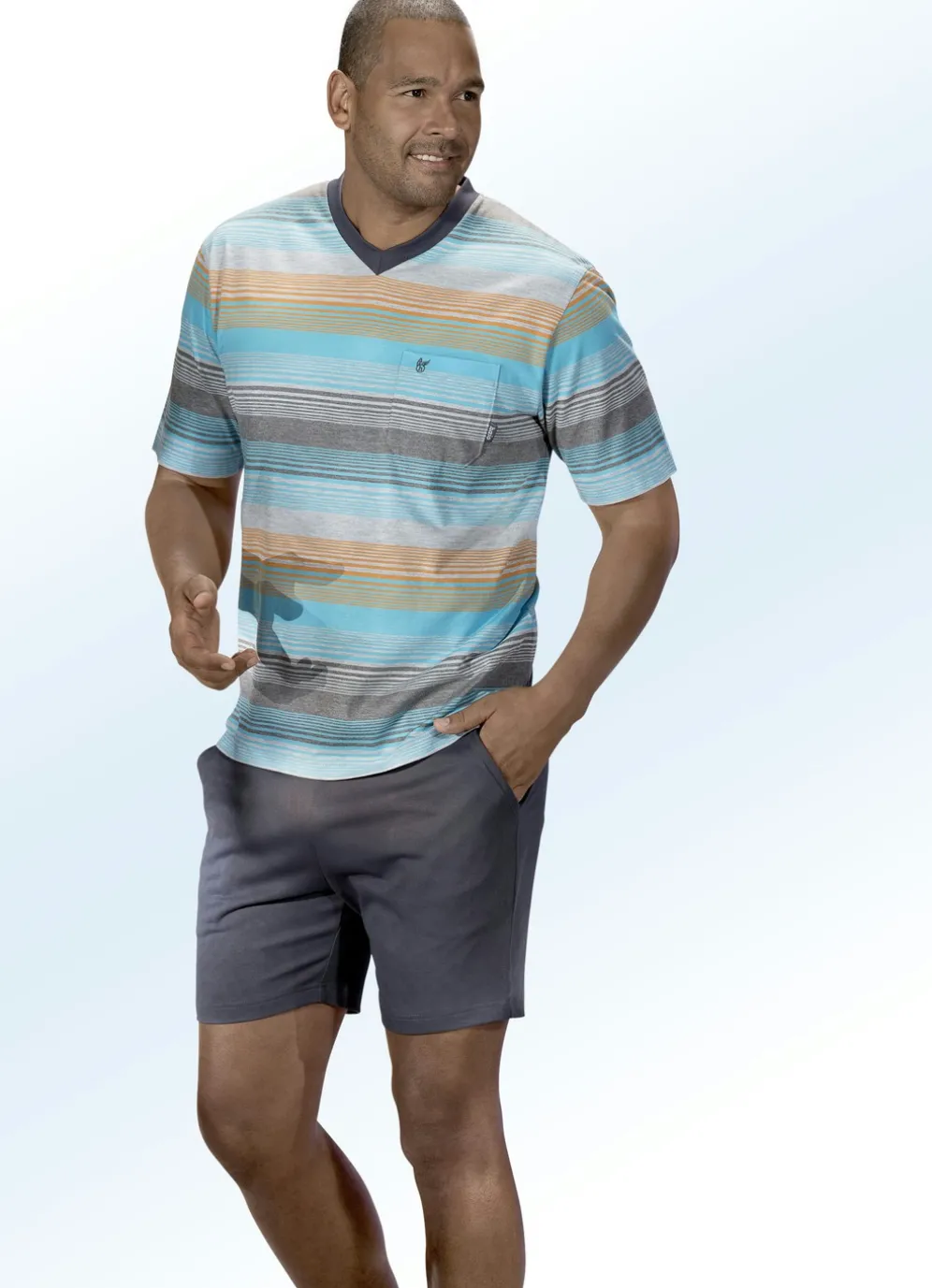 Tolles Shorty von „hajo“: Oberteil mit garngefärbtem Ringeldessin in Türkis-Orange-Grau meliert, V-Ausschnitt, aufgesetzter Brusttasche und Seitenschlitzen. Shorts in Grafit mit Durchzugsband im Dehnbund, Seitentaschen sowie offenen Beinabschlüssen.