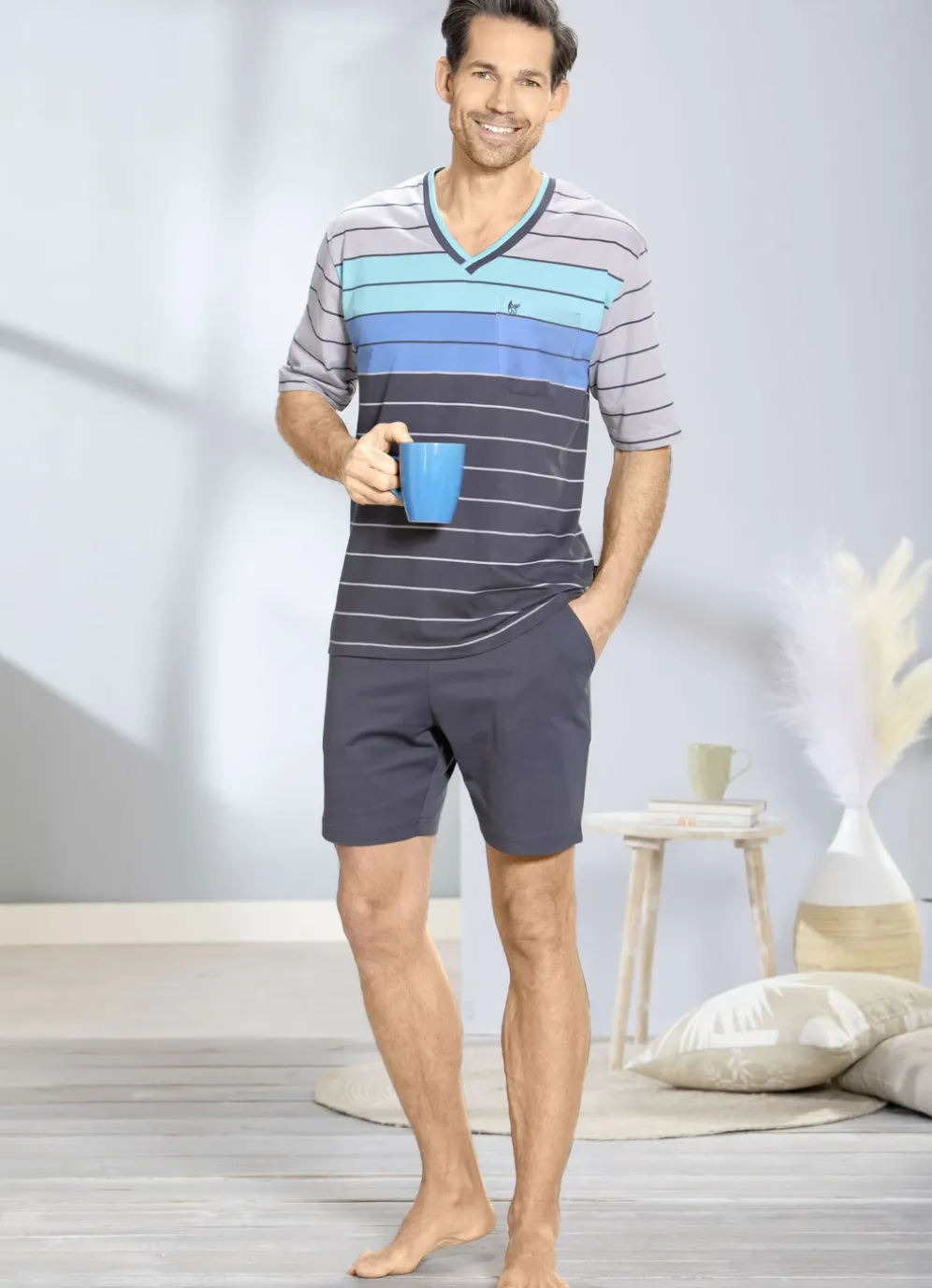 „hajo“-Shorty: Oberteil mit garngefärbtem Ringeldessin in Grafit-Grau-Blau, V-Ausschnitt, kleinem Stickereimotiv an der aufgesetzten Brusttasche sowie kleinen Seitenschlitzen. Shorts in Grafit mit Durchzugsband im Dehnbund sowie Seitentaschen.
