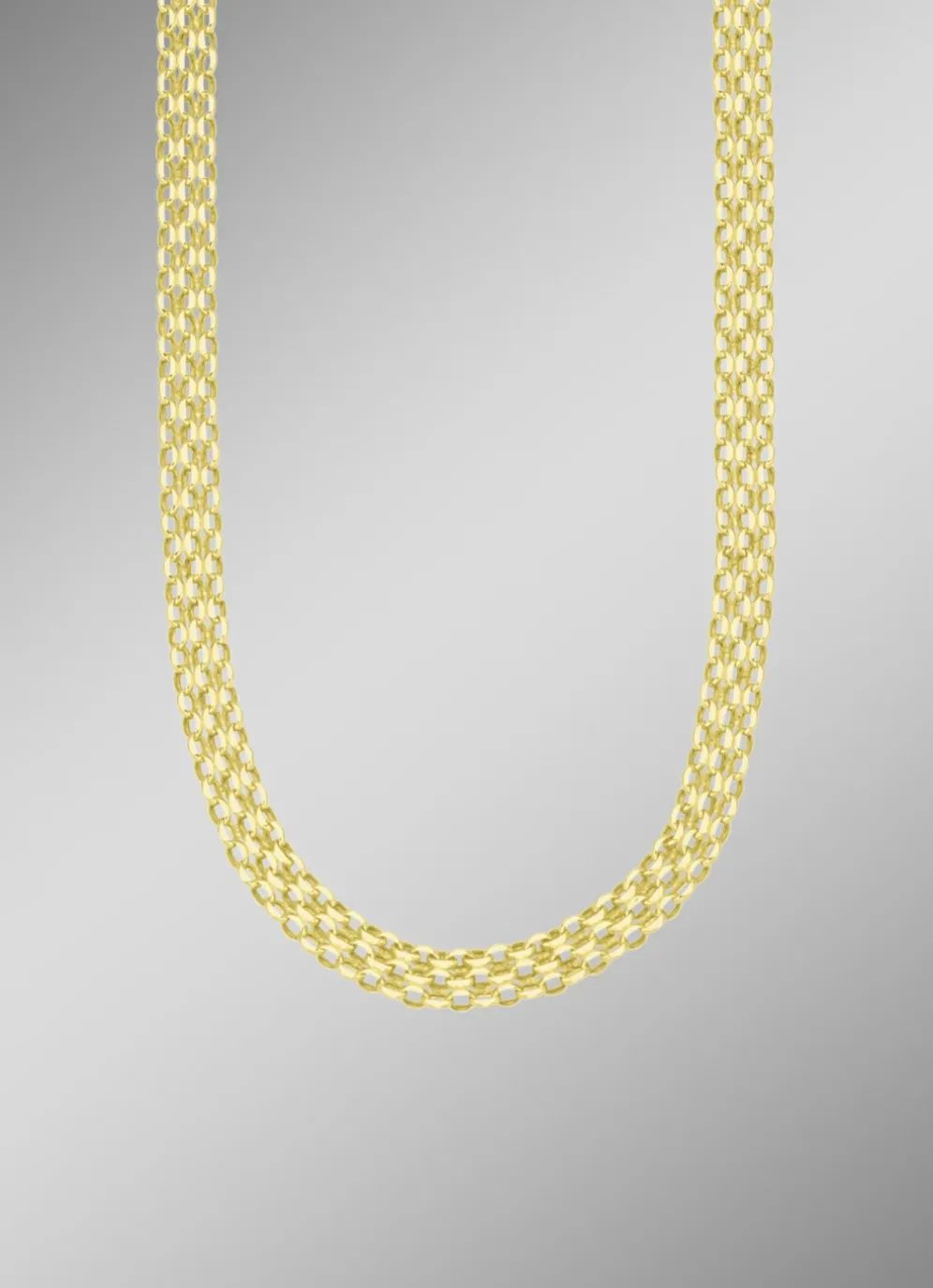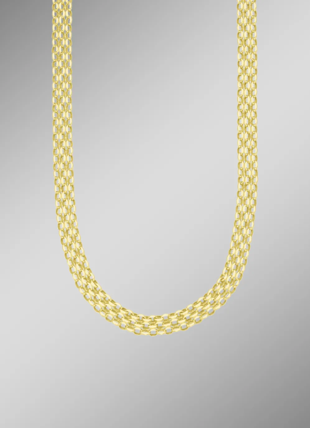 Eine Kette, die jedem Outfit eine moderne Note verleiht ist diese filigrane, ca. 4 mm breite dekorative Halskette in glänzendem Gold 585/- fein. Die flache gedrückte Bismarckkette gehört zu den beliebten klassischen Kettenmustern. Sie ist ein echter Blickfang für das Dekolleté und wird einzeln solo ohne Anhänger getragen.