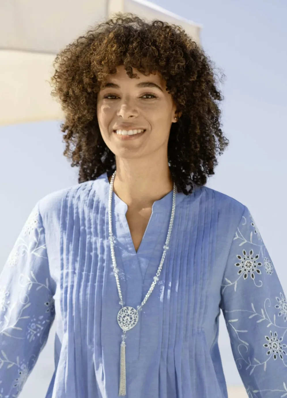 Halskette mit Anhänger und Quaste in Silberfarben.