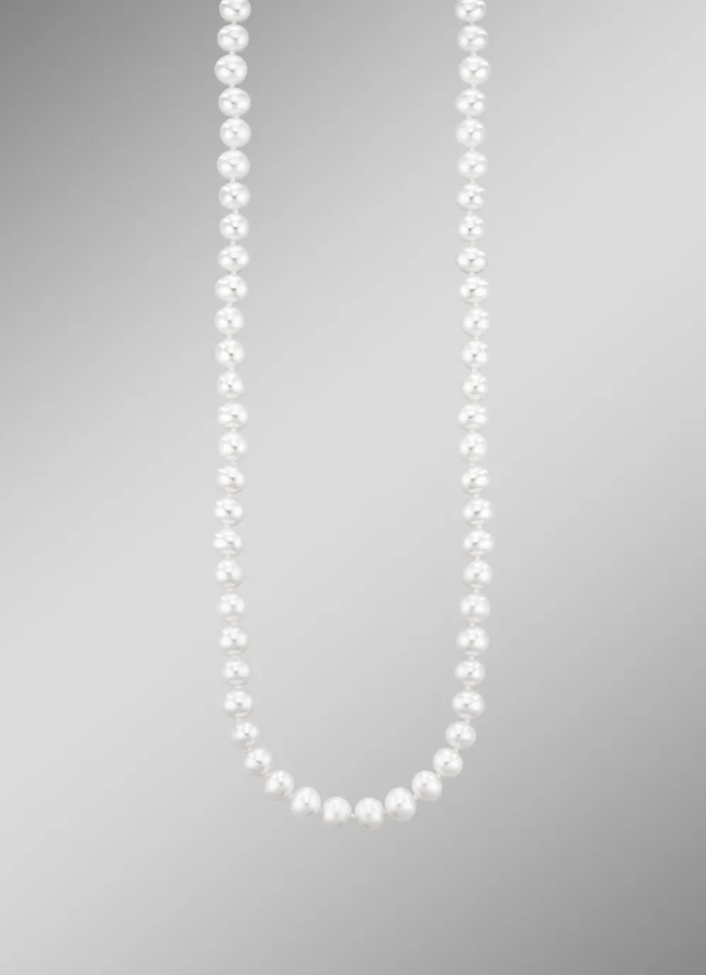Halskette mit Süßwasser-Zuchtperlen mit einem Durchmesser von Perlen-ø 8–9 mm, in der Länge von 45 cm sowie in der Legierung Silber 925/- fein.
