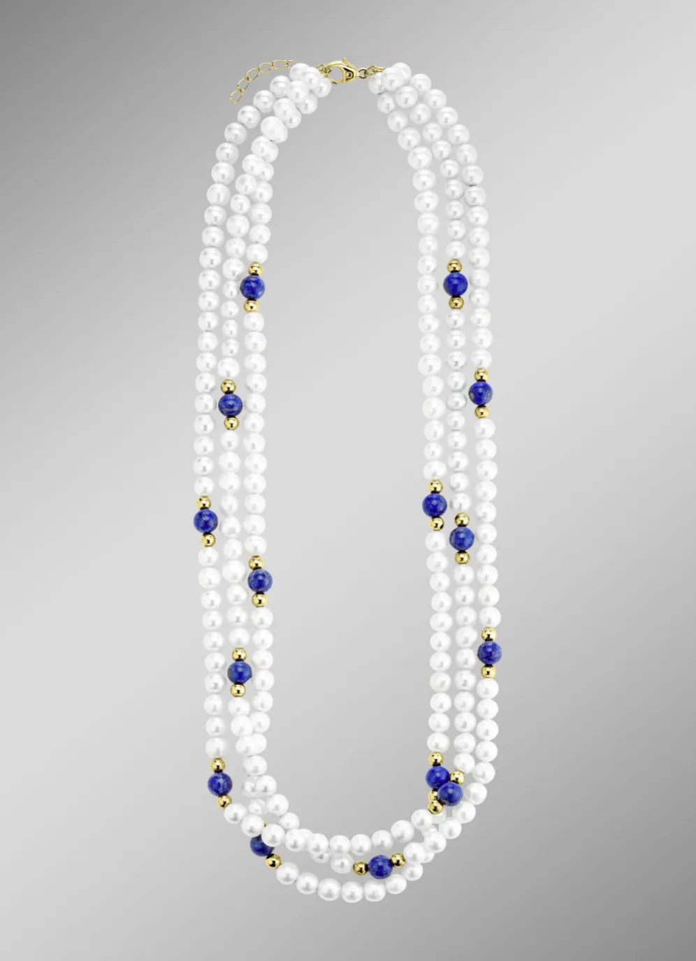 Entdecken Sie die Magie von Luxus und Stil mit dieser einzigartigen Halskette aus Gold 585/- fein. Die dreireihige Komposition verbindet das schimmernde Gold mit edlen Süßwasser-Zuchtperlen (5 mm), tiefblauen, echten Lapislazuli-Steinen (6 mm) und glänzenden Goldkugeln (4 mm). Der hochwertige Karabinerverschluss sorgt nicht nur für Sicherheit, sondern auch für höchsten Tragekomfort. Mit einer Länge von 48 cm plus einer 3 cm Verlängerung fügt sich die Kette perfekt in jedes Outfit ein – ein zeitloses Schmuckstück für jede Gelegenheit.