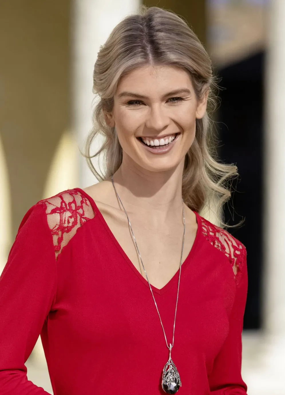 Verleihen Sie Ihrem Look einen Hauch von zeitloser Eleganz mit dieser exquisiten Halskette.Der graue Tropfenanhänger, kunstvoll facettiert, fängt das Licht auf faszinierende Weise ein und sorgt für ein funkelndes Highlight bei jeder Bewegung. Die rhodinierte Kette mit einer Länge von 76 cm und einer zusätzlichen Verlängerung von 7 cm bietet Ihnen Flexibilität und Komfort, sodass Sie die perfekte Passform finden.