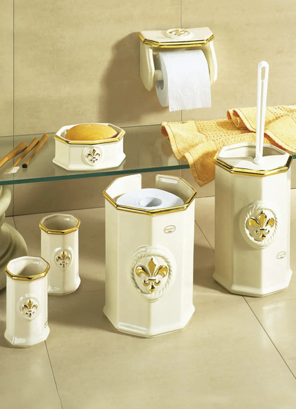 Wunderschöne, im klassischen Stil zeitlos edle Badezimmeraccessoires in Creme-Gold mit handaufgetragener Goldfarbe (10% Echtgoldanteil) auf der Ornamentzier und den Rändern. In italienischen Werkstätten aufwendig aus glasierter Keramik gefertigt.