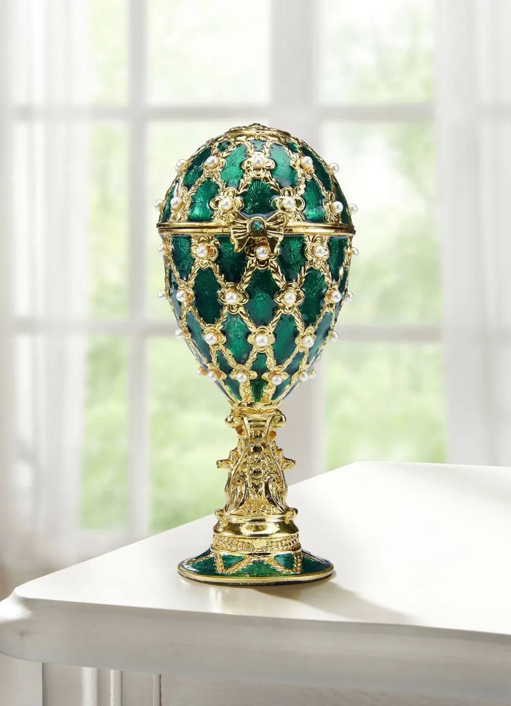 Diese hübsche Spieluhr wurde im Stil eines Fabergé-Eis gestaltet. Aufwendig mit hochwertiger Emaille bearbeitet und zusätzlich mit goldfarbenen Verzierungen von Hand bemalt und mit kleinen weißen Perlen ergänzt. Die Spitze des Eis wird von einem Strass-Stein gekrönt.