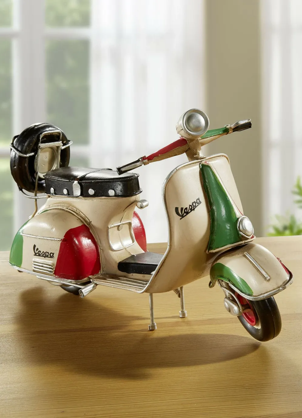 Holen Sie sich einen Hauch Italien in Ihr Zuhause. Mit dieser tollen Vespa, die in den Farben der italienischen Flagge von Hand bemalt wurde. Mit beweglichen Rädern und einem Ersatzrad. Liebevoll aus Blech gefertigt. Maße: L22xB14xH10 cm.