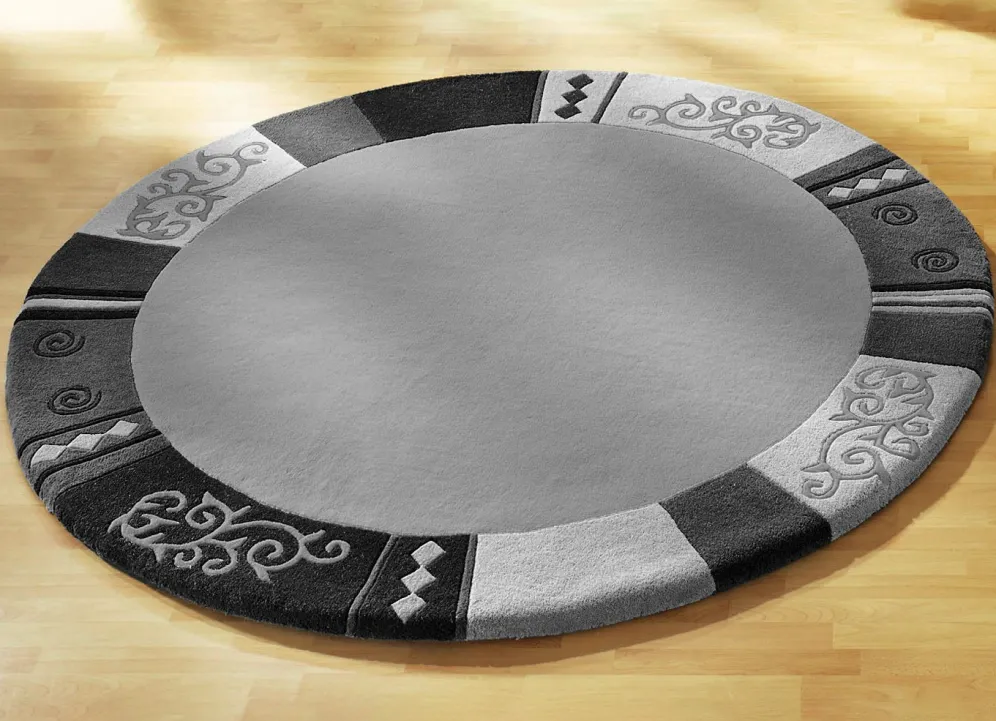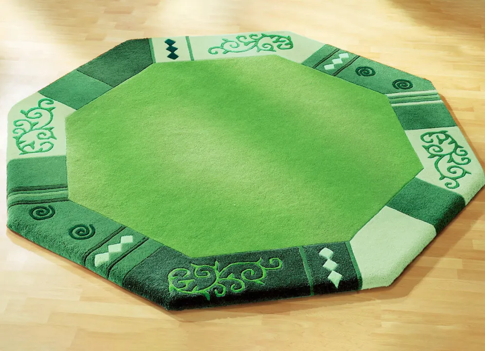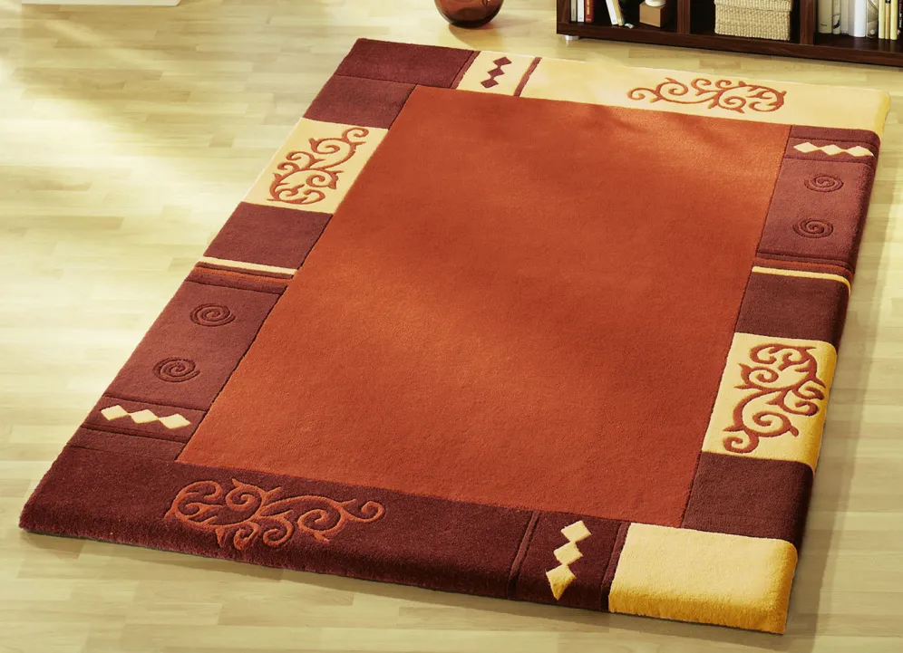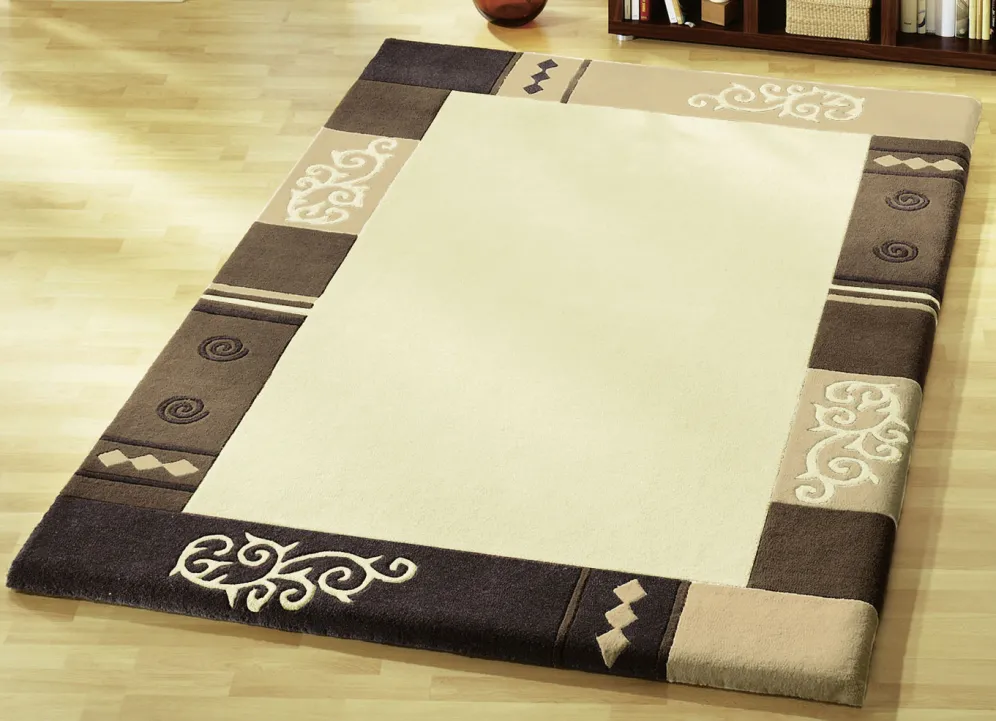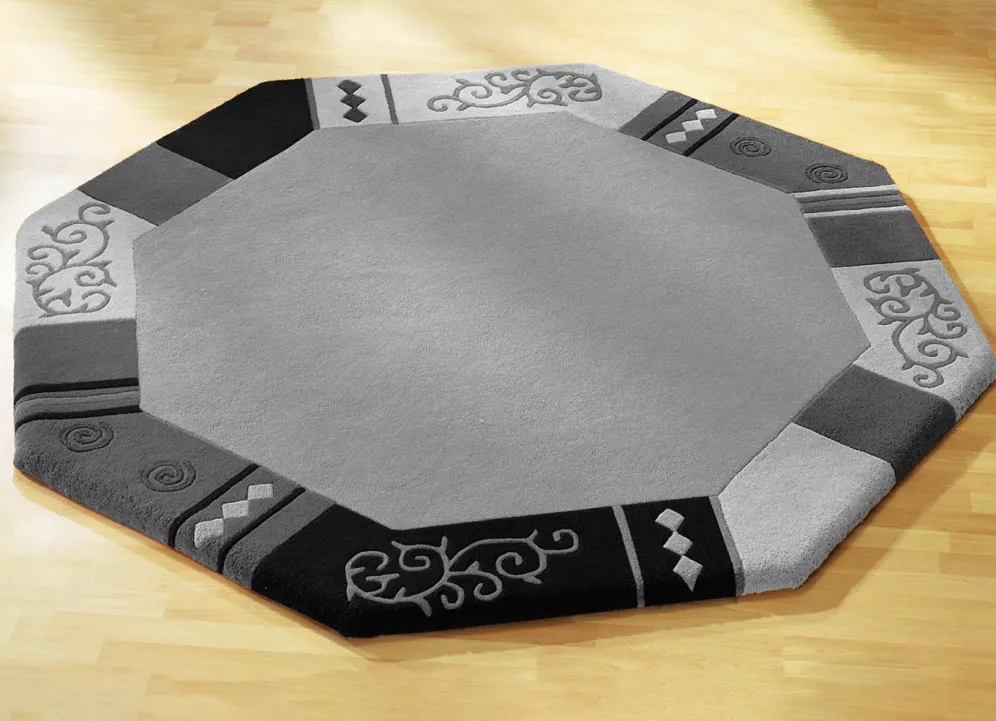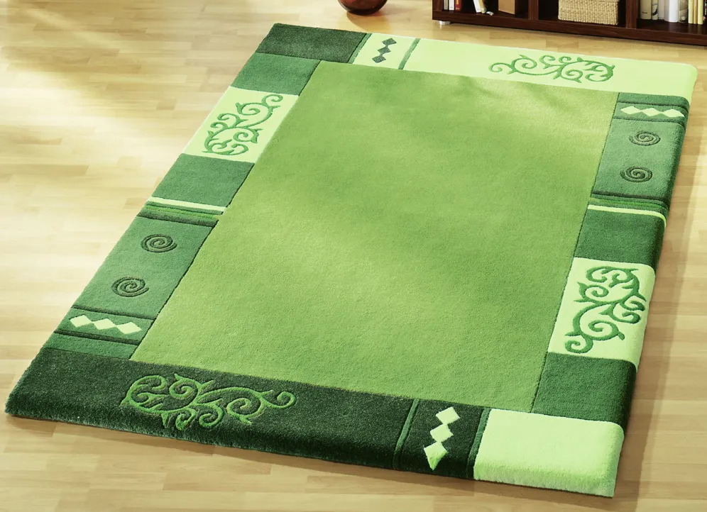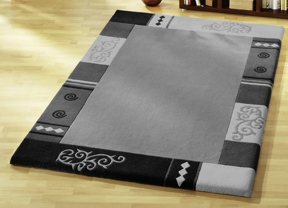 Handgetuftet: Der Flor des Teppichs wird von Hand mit Nadeln auf das Grundgewebe aufgebracht. Die Verankerung erfolgt durch eine nachträgliche Beschichtung der Rückseite. Danach werden die Konturen aufwendig herausgearbeitet.